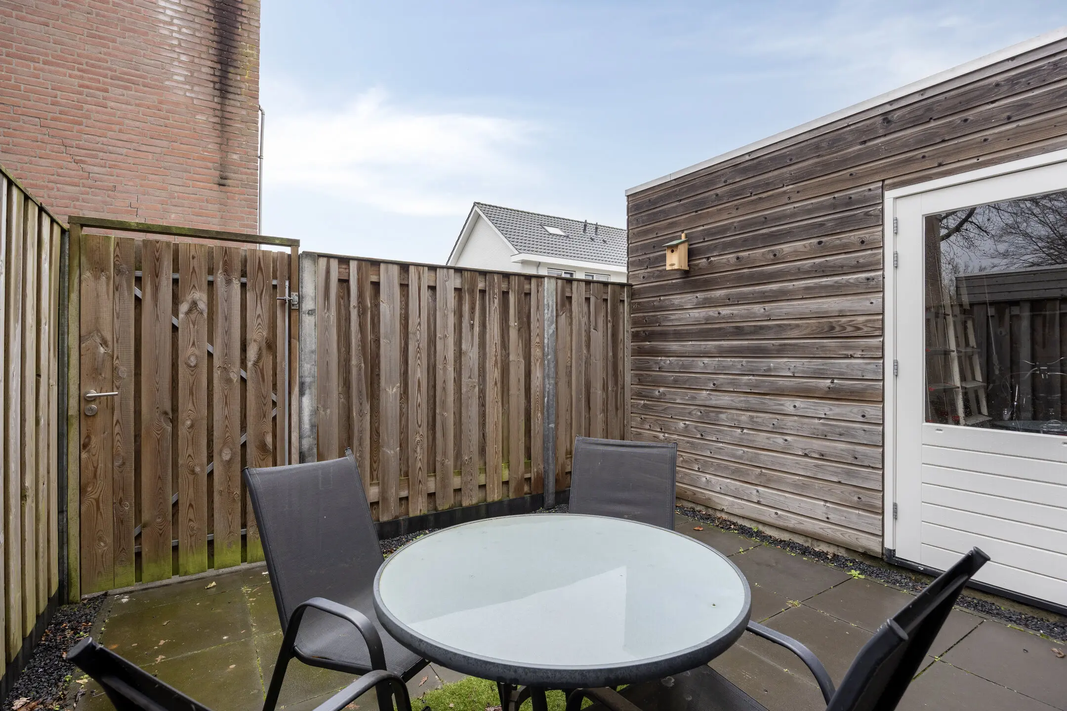 De tuin is onderhoudsvriendelijk ingericht en dankzij de achterom ook praktisch bereikbaar. De schuur zorgt voor extra bergruimte, ideaal voor fietsen, gereedschap of sportspullen.
