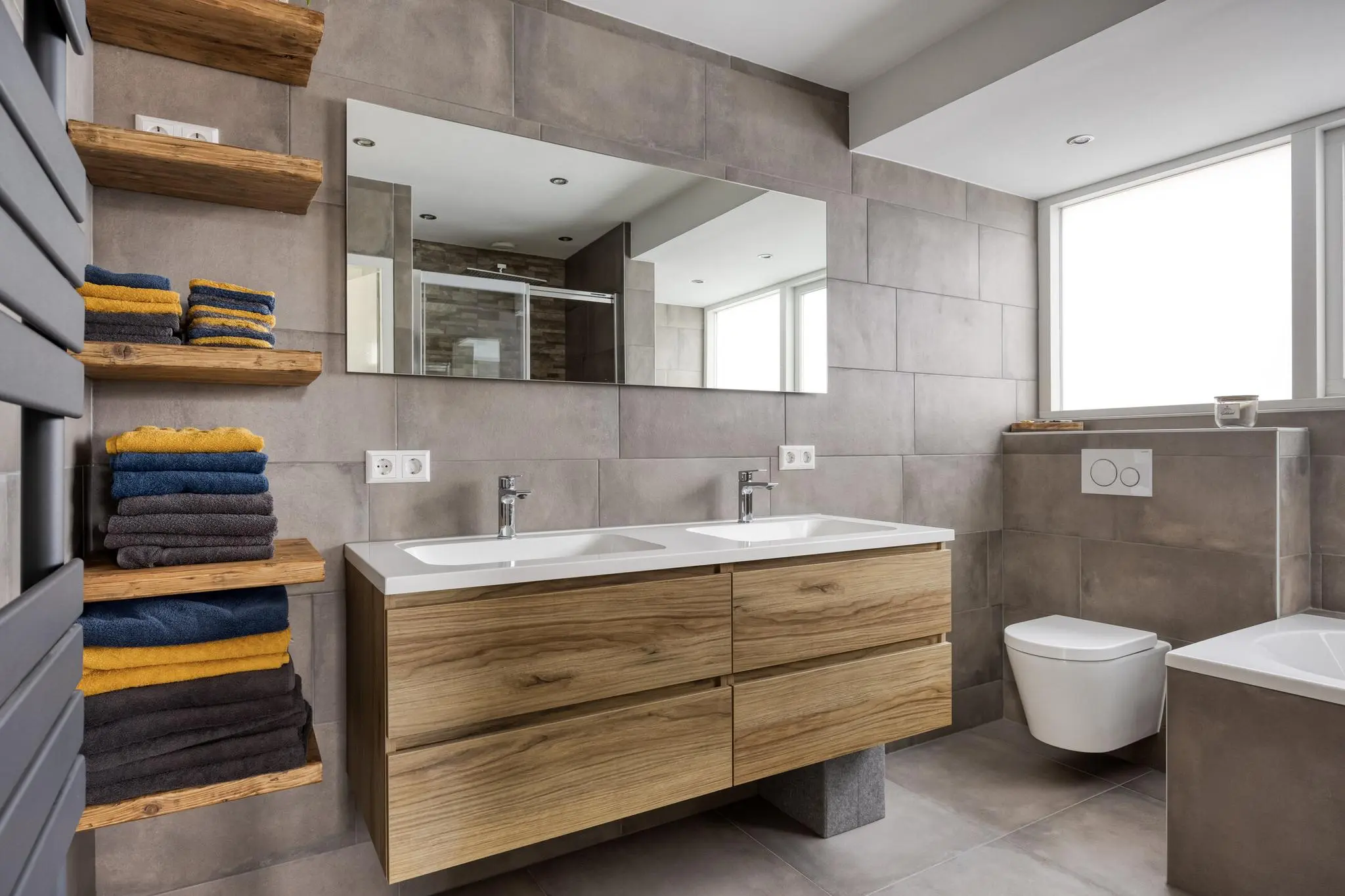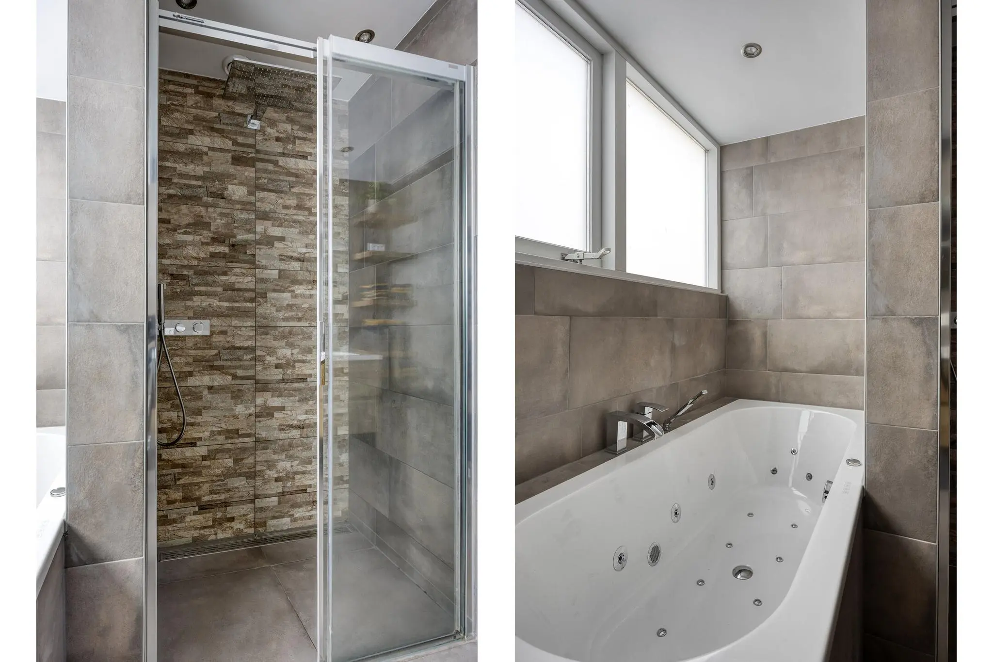• Moderne badkamer (2022) – met ruime regendouche, bubbelbad en verwarmde spiegel