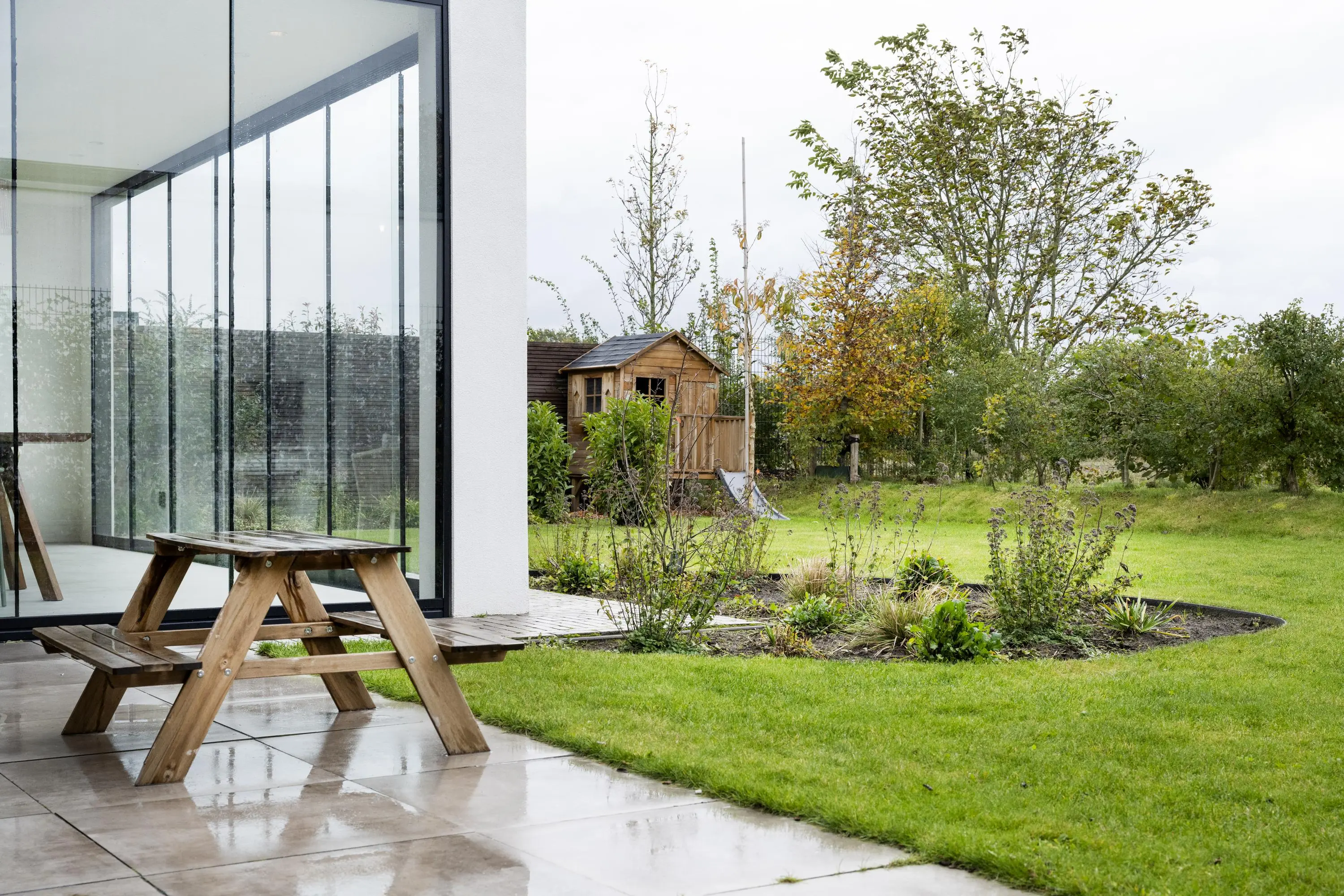 Buiten vind je een goed onderhouden tuin met zowel een achtertuin, voortuin als een zijtuin. De achtertuin met vrij uitzicht is voorzien van een tuinhuis, zandbak, trampoline en een kippenren. Tevens is de er een Rainbird bewateringsysteem in zowel de voor- en achtertuin.