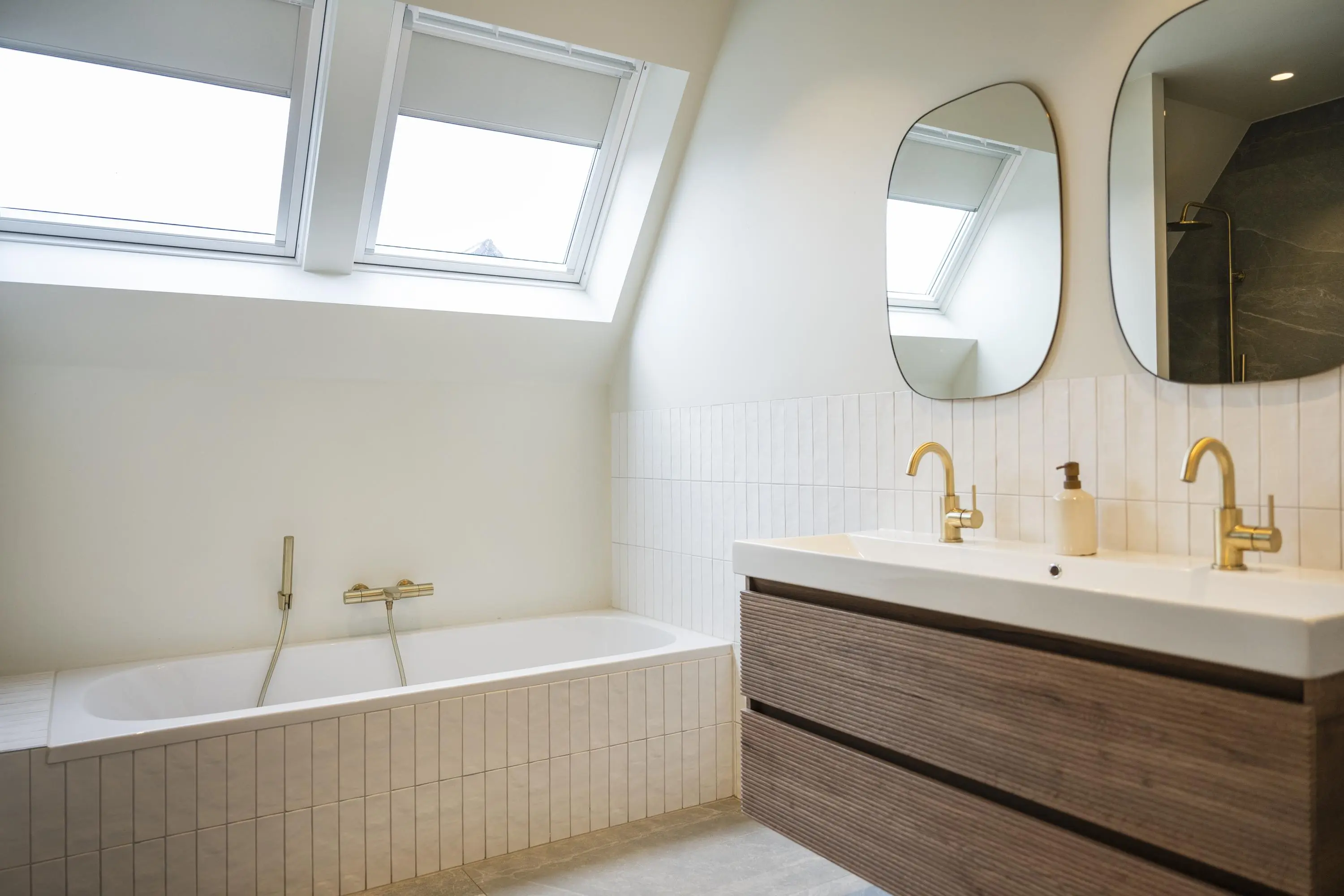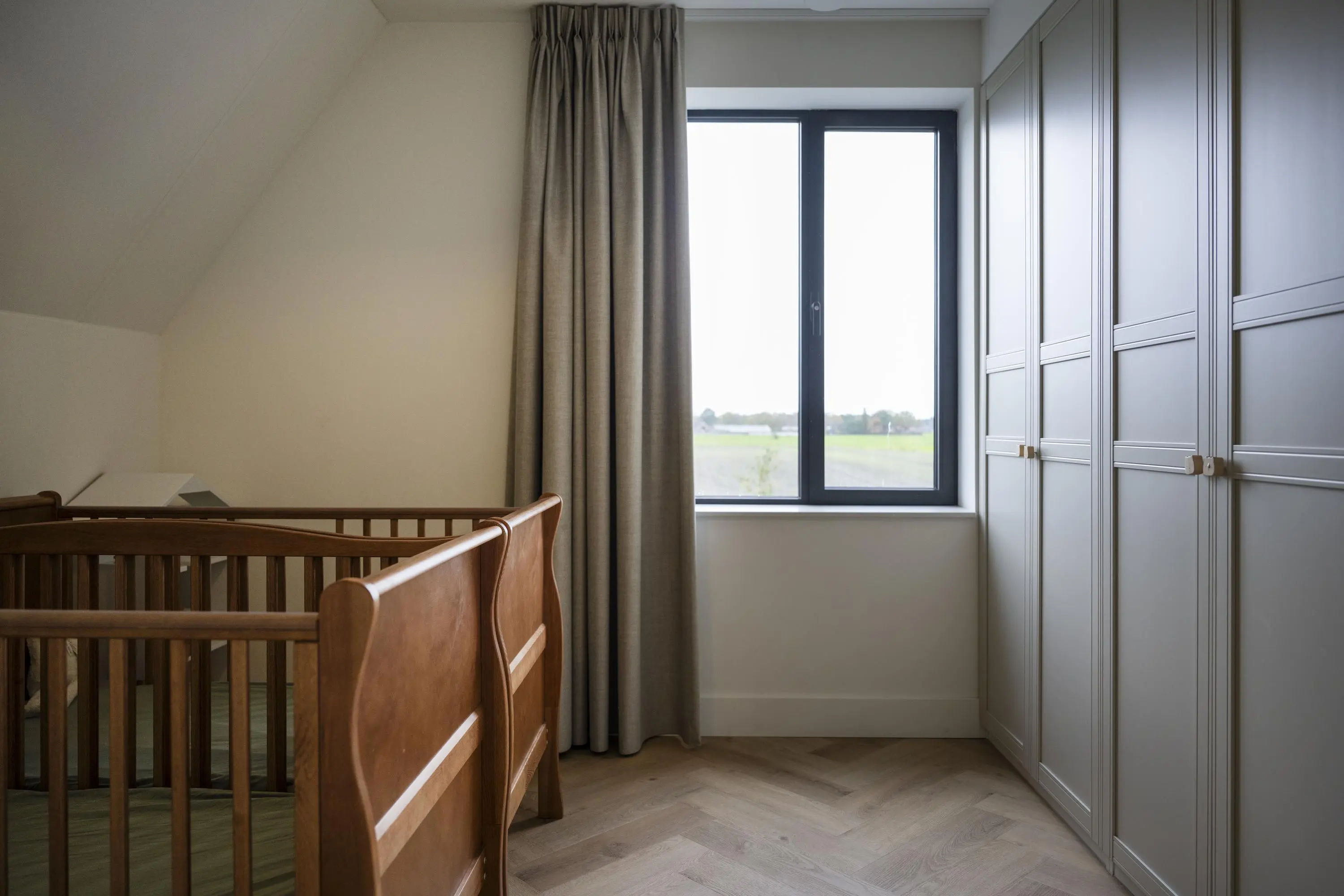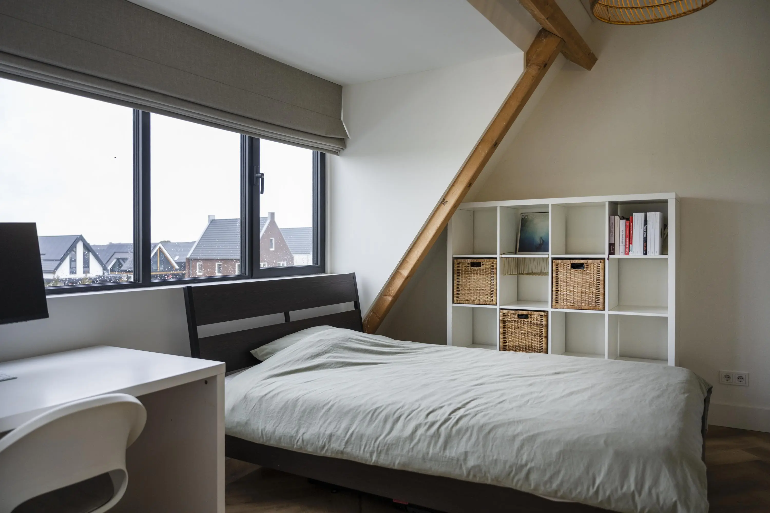 Op de eerste verdieping vinden we een viertal kamers welke allen zijn voorzien van een praktische inbouwkast, tevens biedt een van de slaapkamer ook toegang tot de stookruimte. De badkamer (2023) is voorzien van een hangend closet, dubbel wastafelmeubel, ligbad en inloopdouche met hand- en regendouche.