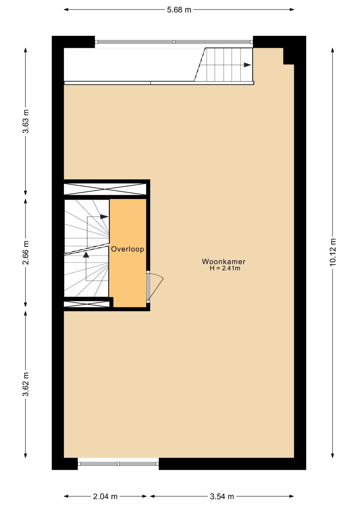 De eerste verdieping is één grote woonkamer. Dankzij de grote ramen stroomt het daglicht binnen en ontstaat een heerlijk ruimtelijk gevoel. De fraaie wengé vloer geeft deze verdieping een warme en luxe uitstraling. Hier heeft u volop plek om verschillende zit- en eetgedeeltes te creëren.