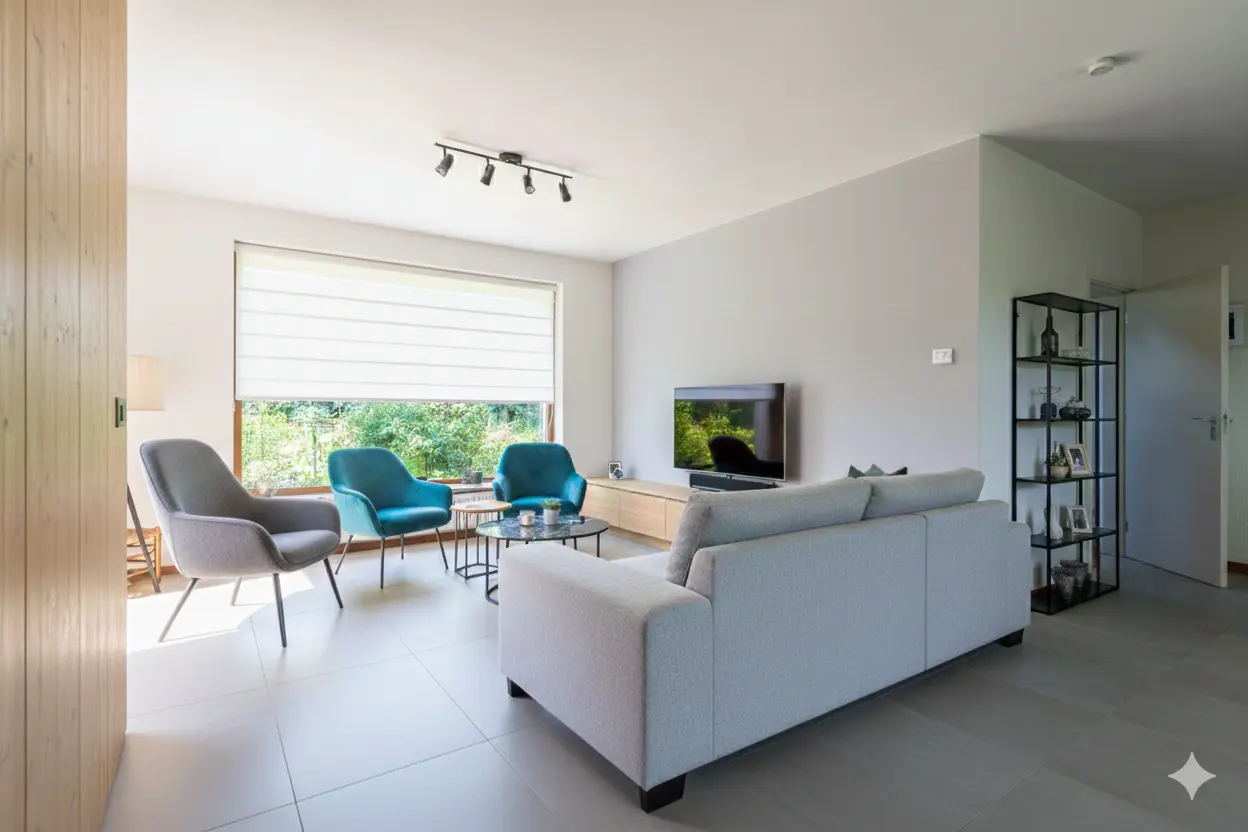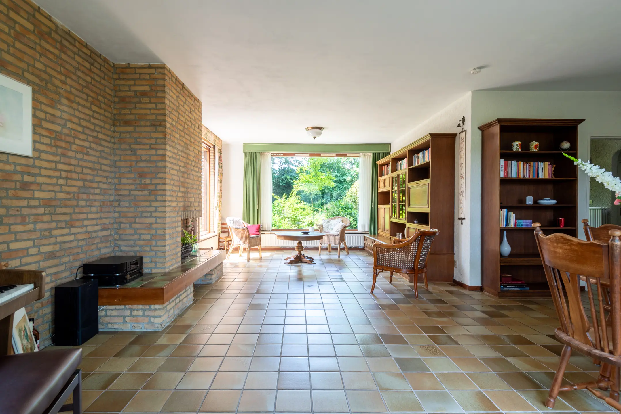 De living geniet van volop natuurlijk lichtinval, een prachtig zicht op de diepe achtertuin.