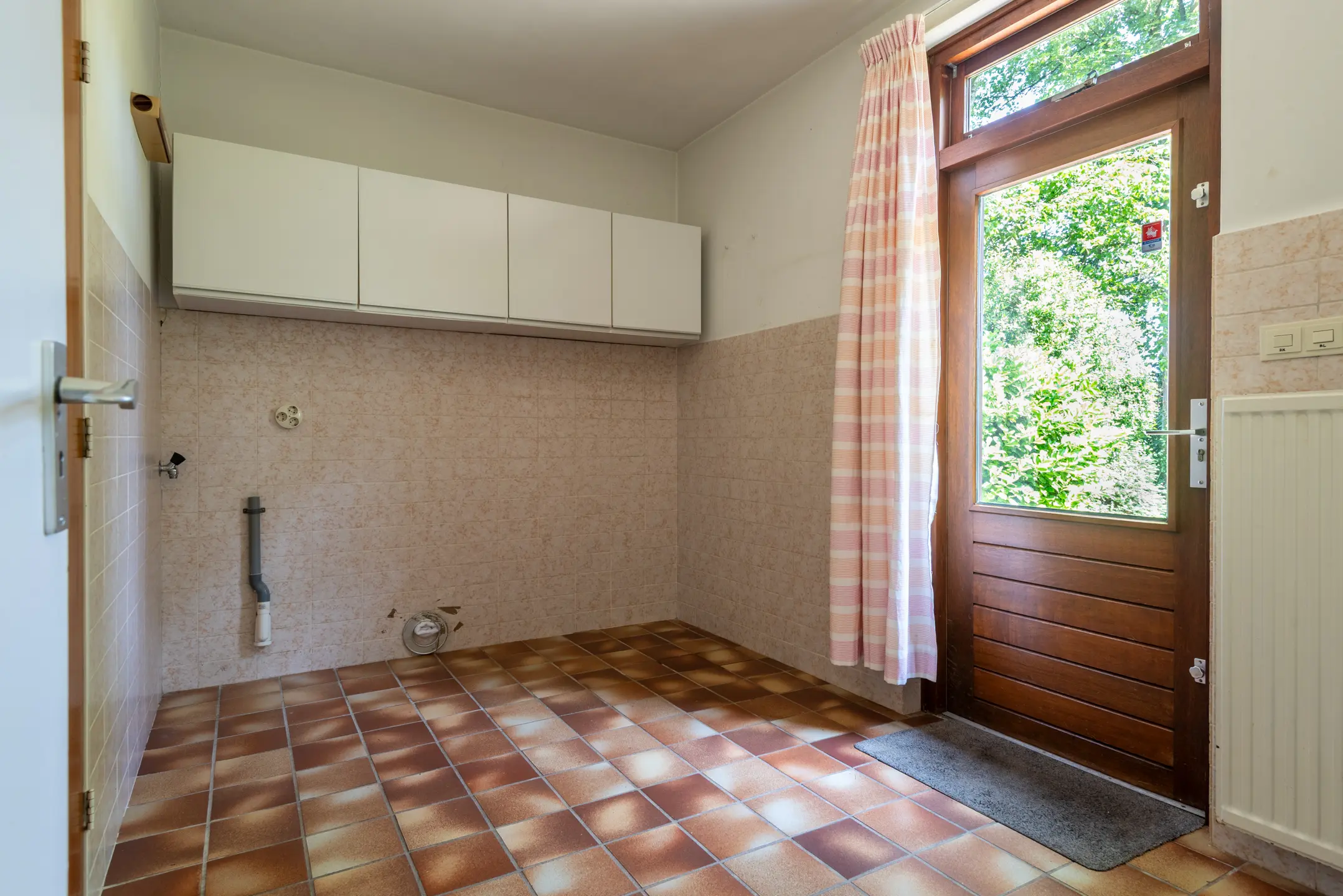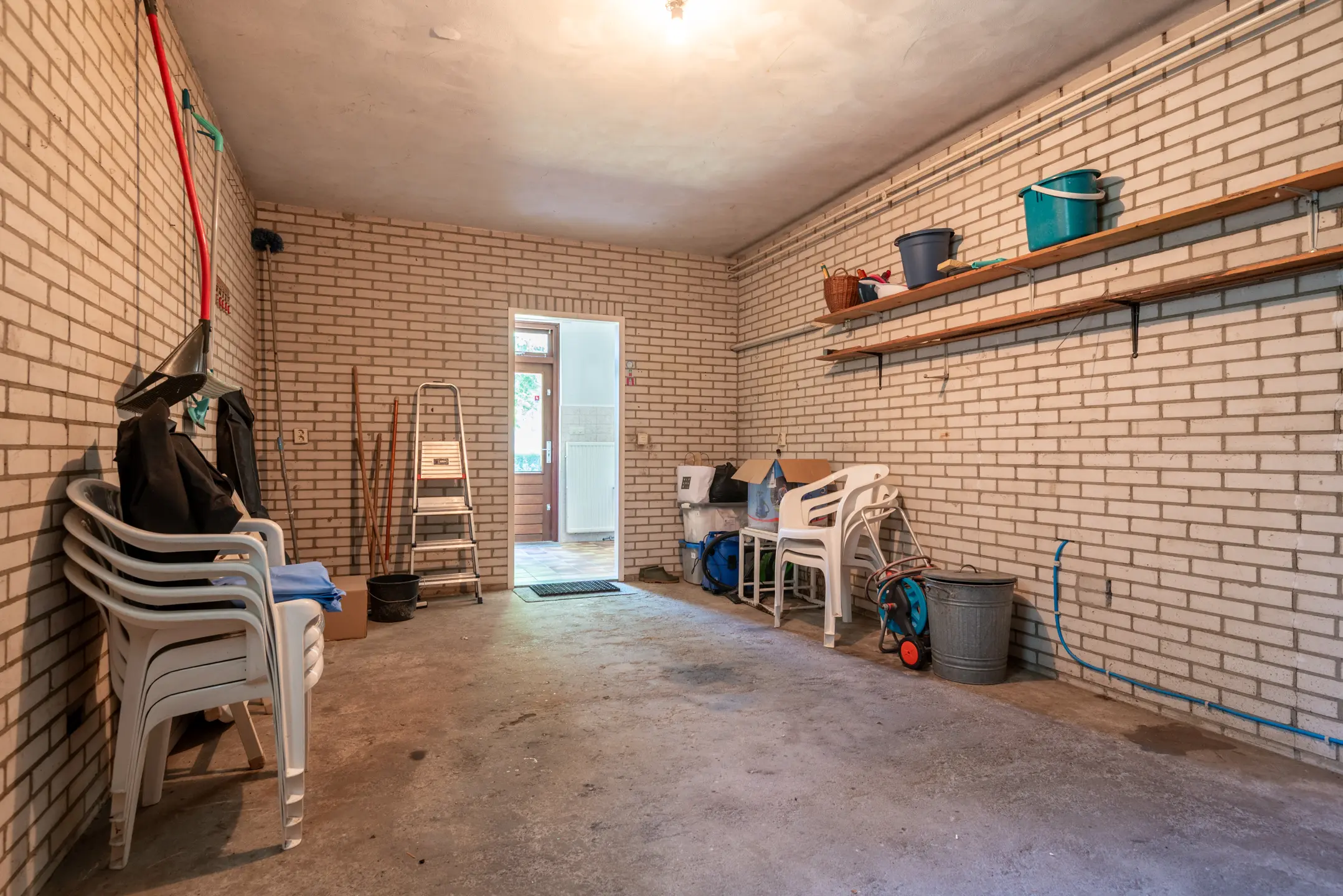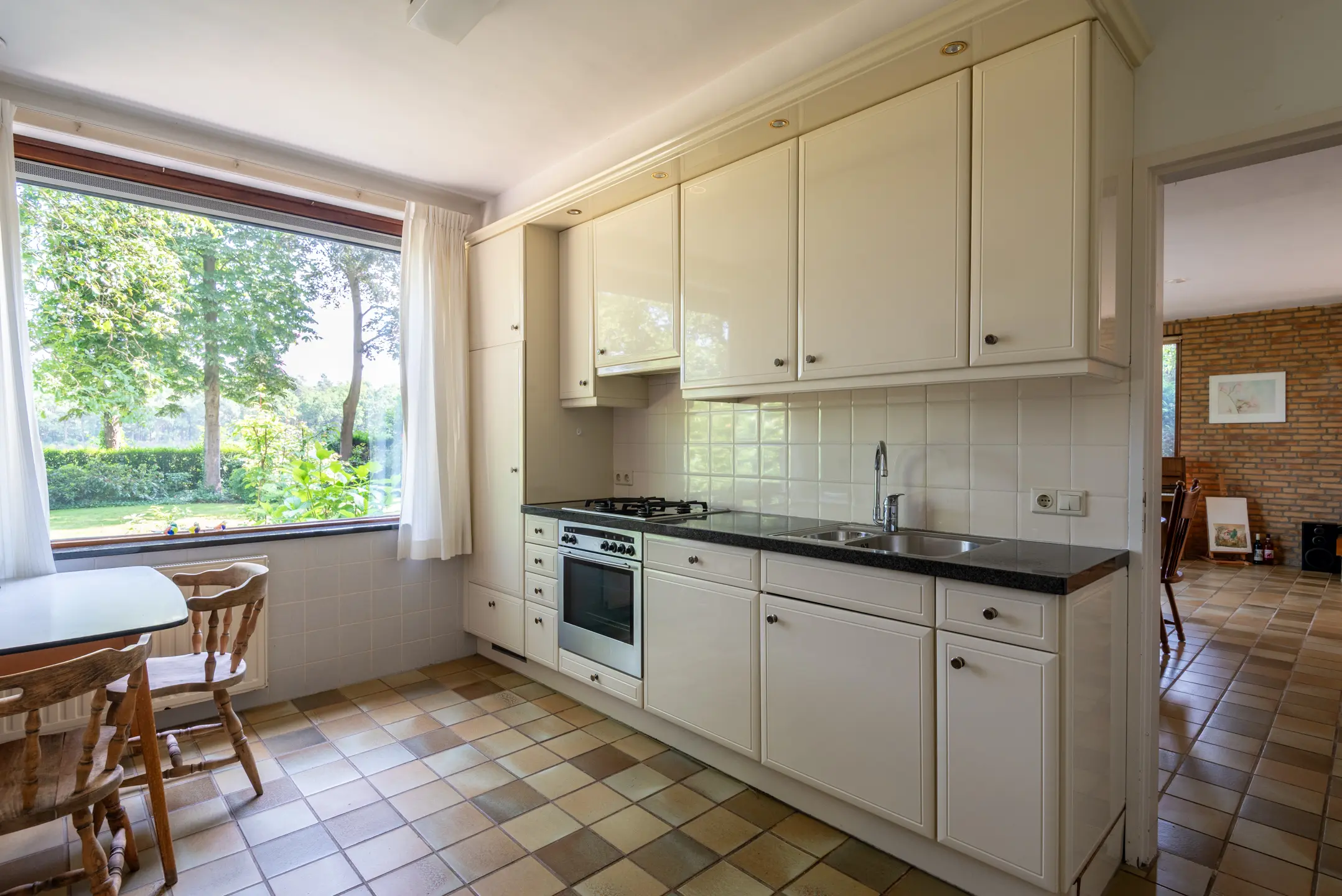 De keuken is functioneel en biedt direct toegang tot de bijkeuken, van waaruit je doorloopt naar de inpandige garage. Deze garage is royaal, verwarmd en ideaal voor hobbyruimte, extra opslag of het stallen van voertuigen. Ook biedt deze ruimte veel potentieel voor het realiseren van een kantoor of praktijk aan huis.