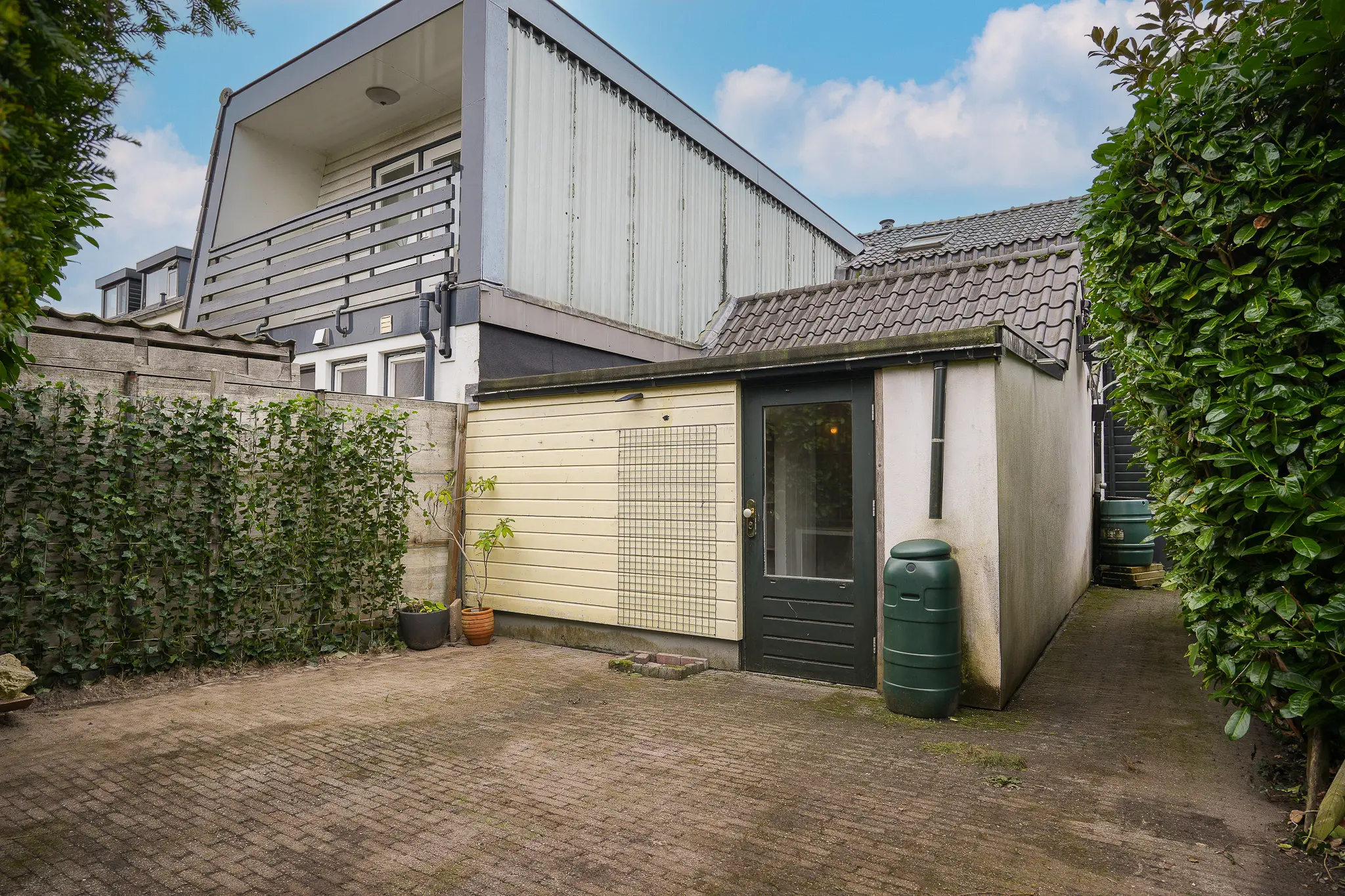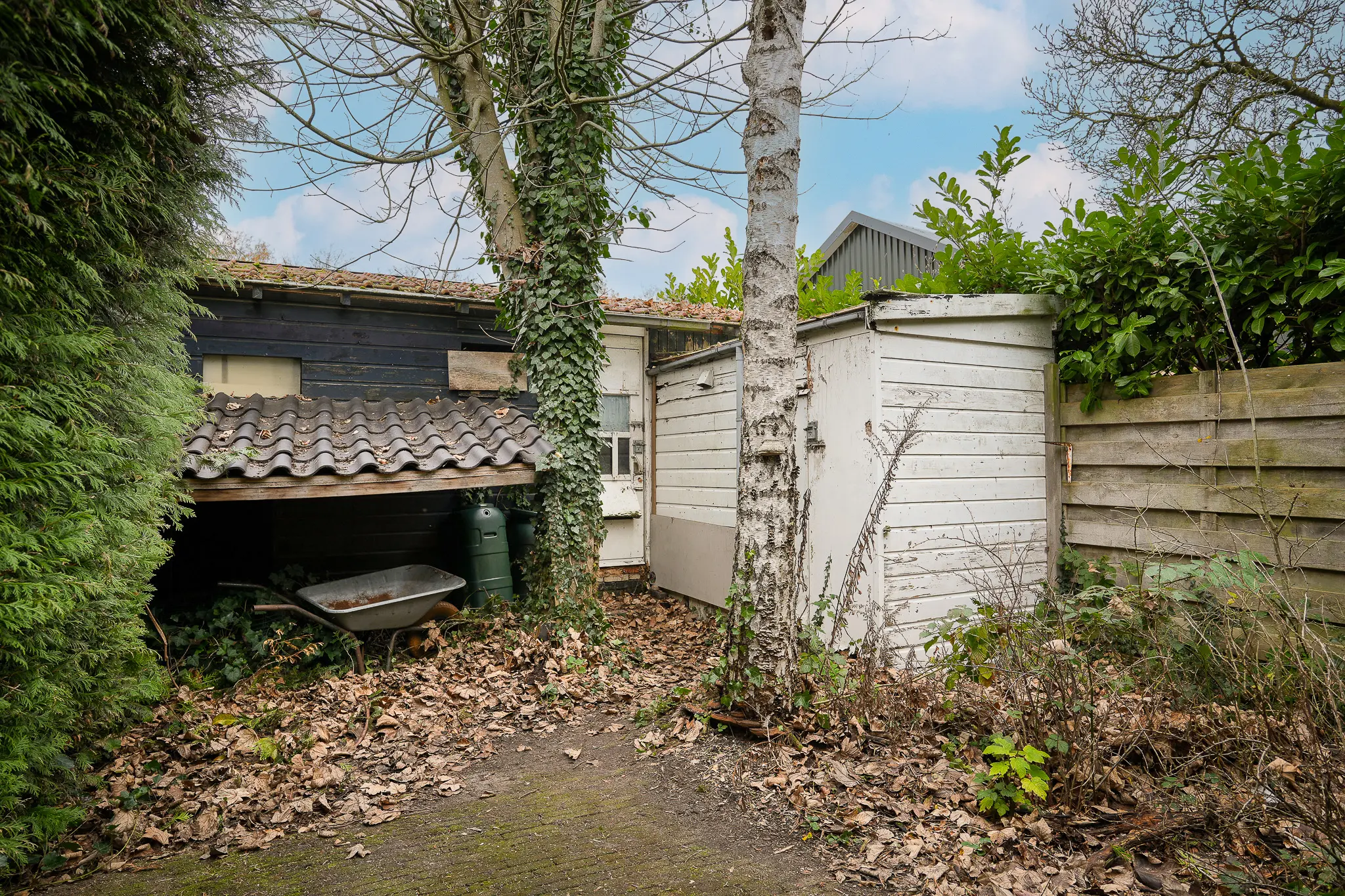 Achter in de tuin staan een grote houten berging en een extra houten schuur, ideaal als opslag, werkruimte of hobbyruimte. De huidige kippenren kan uiteraard naar wens behouden of verwijderd worden.
