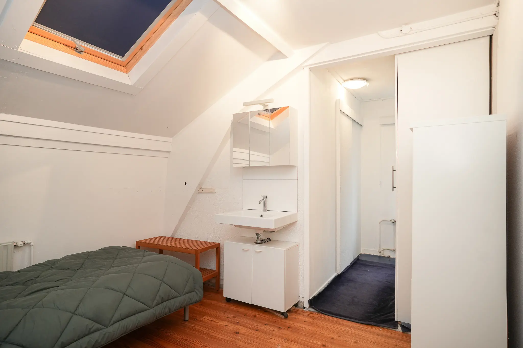 Een slaapkamer aan de voorzijde met Velux-dakraam en toegang tot de tweede badkamer.