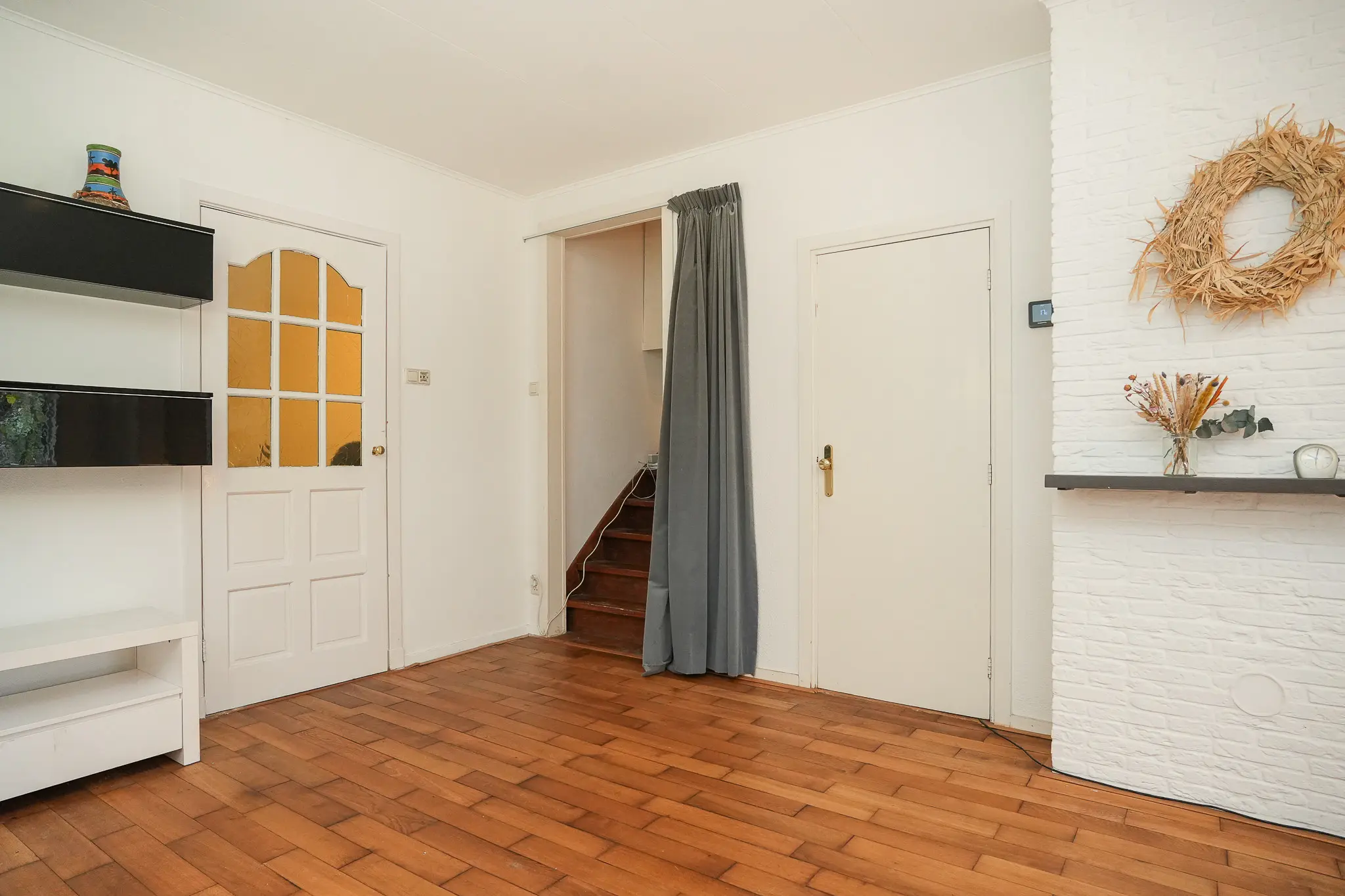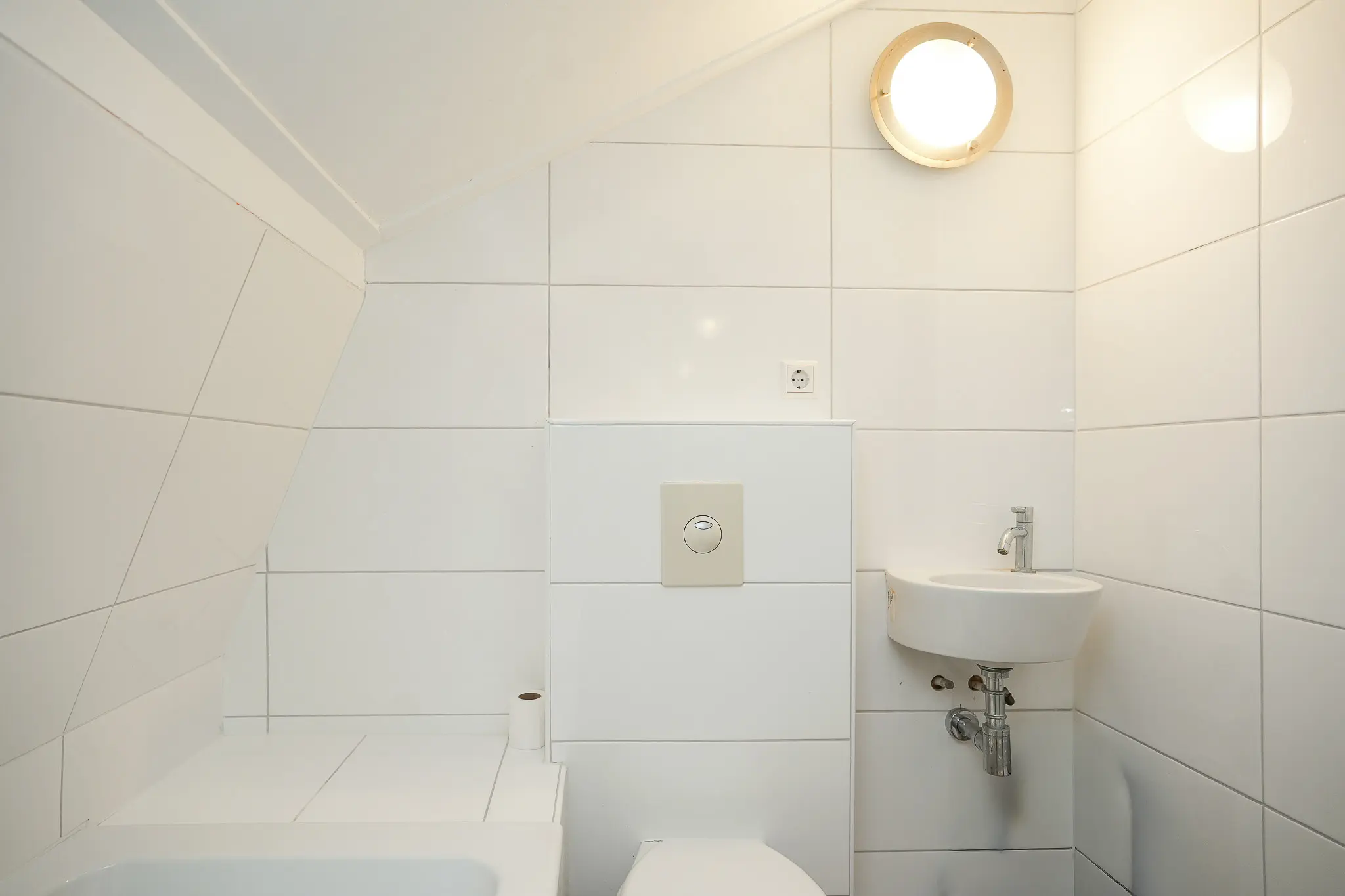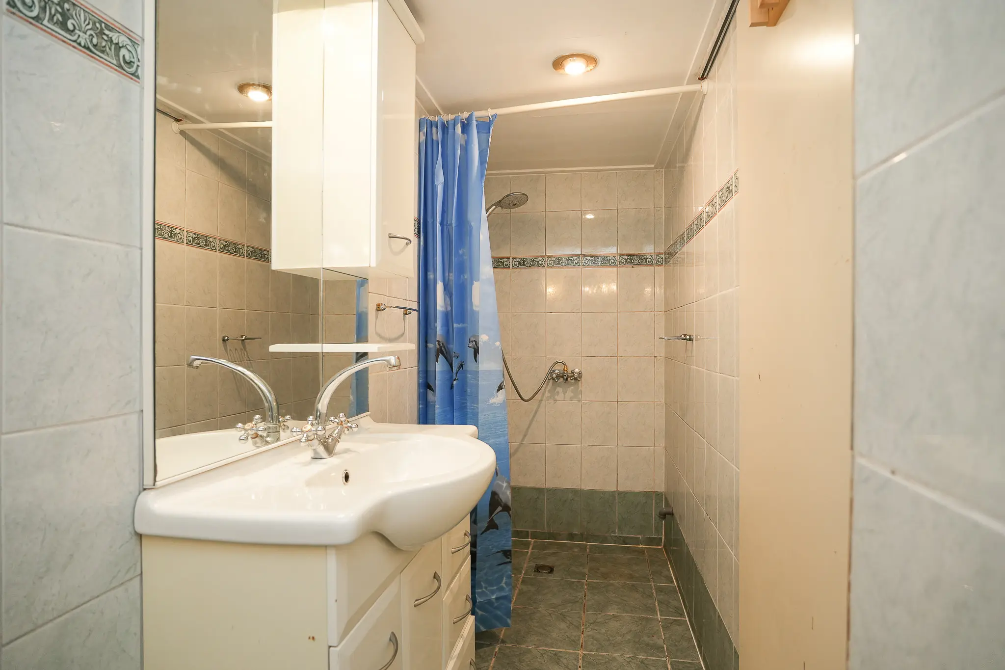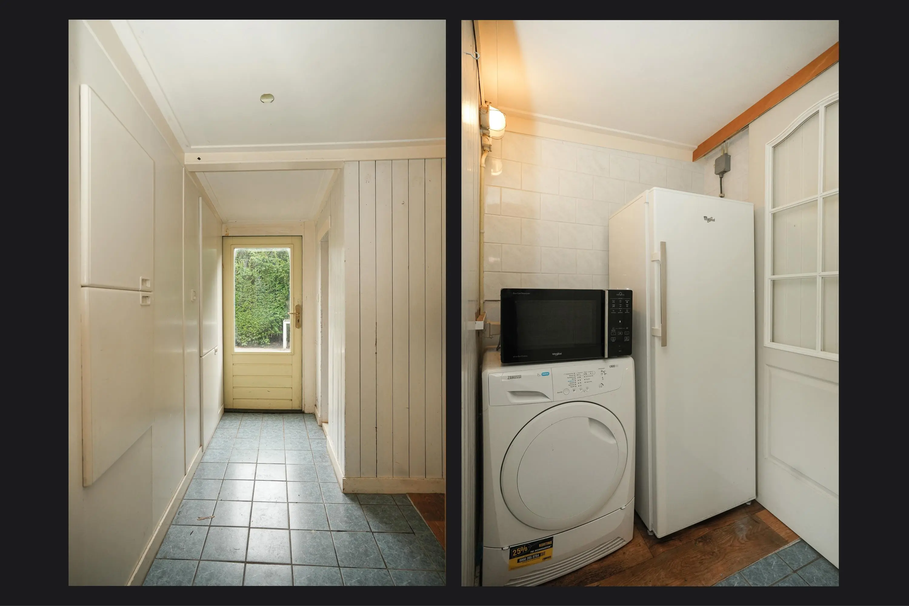 Je komt binnen via de praktische bijkeuken met aansluitingen voor wasmachine en droger en directe toegang tot een inpandige berging. Vanuit de bijkeuken loop je door naar de badkamer op de begane grond, voorzien van douche, toilet en wastafel.