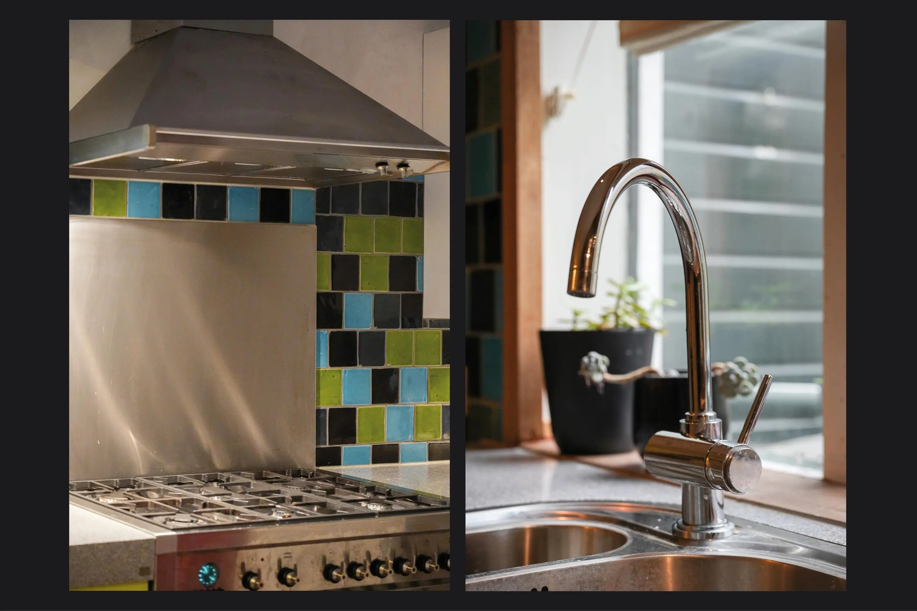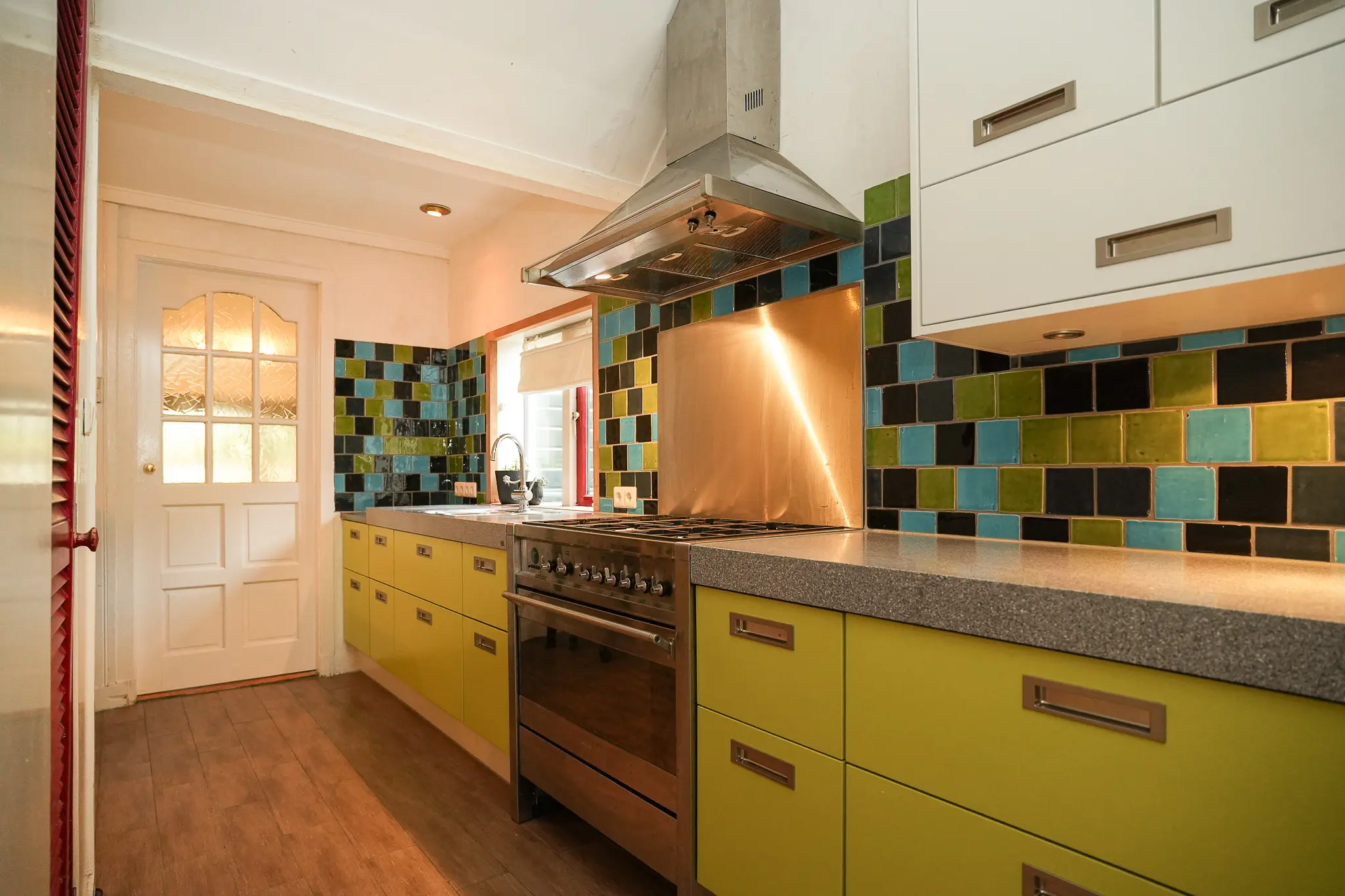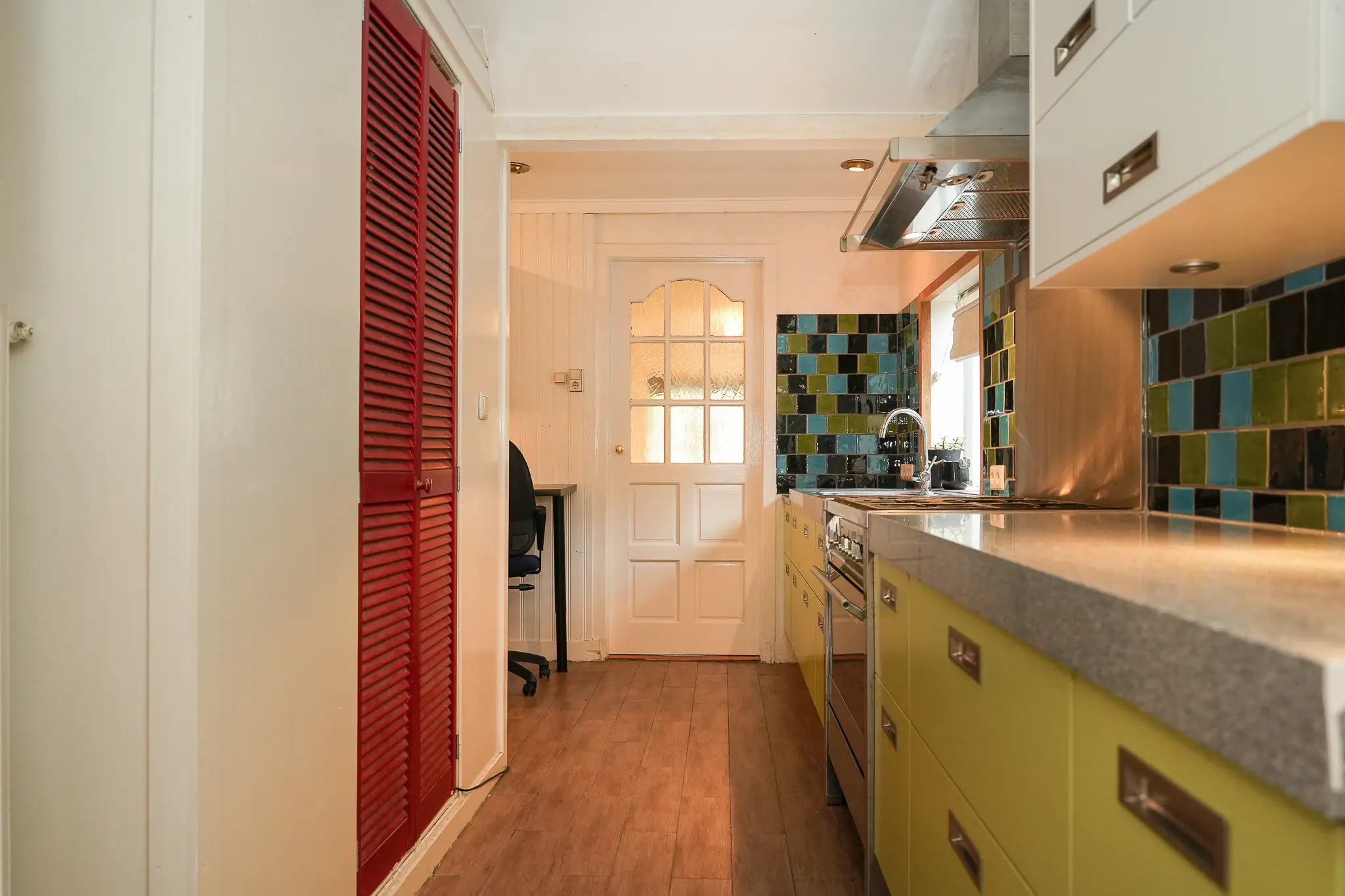 De ruime keuken strekt zich uit over een lengte van circa 7 meter en is uitgerust met onder andere een gasfornuis, afzuigkap en extra opstellingsruimte voor witgoed. Dankzij de lengte en vorm is het een fijne werk- en leefkeuken.