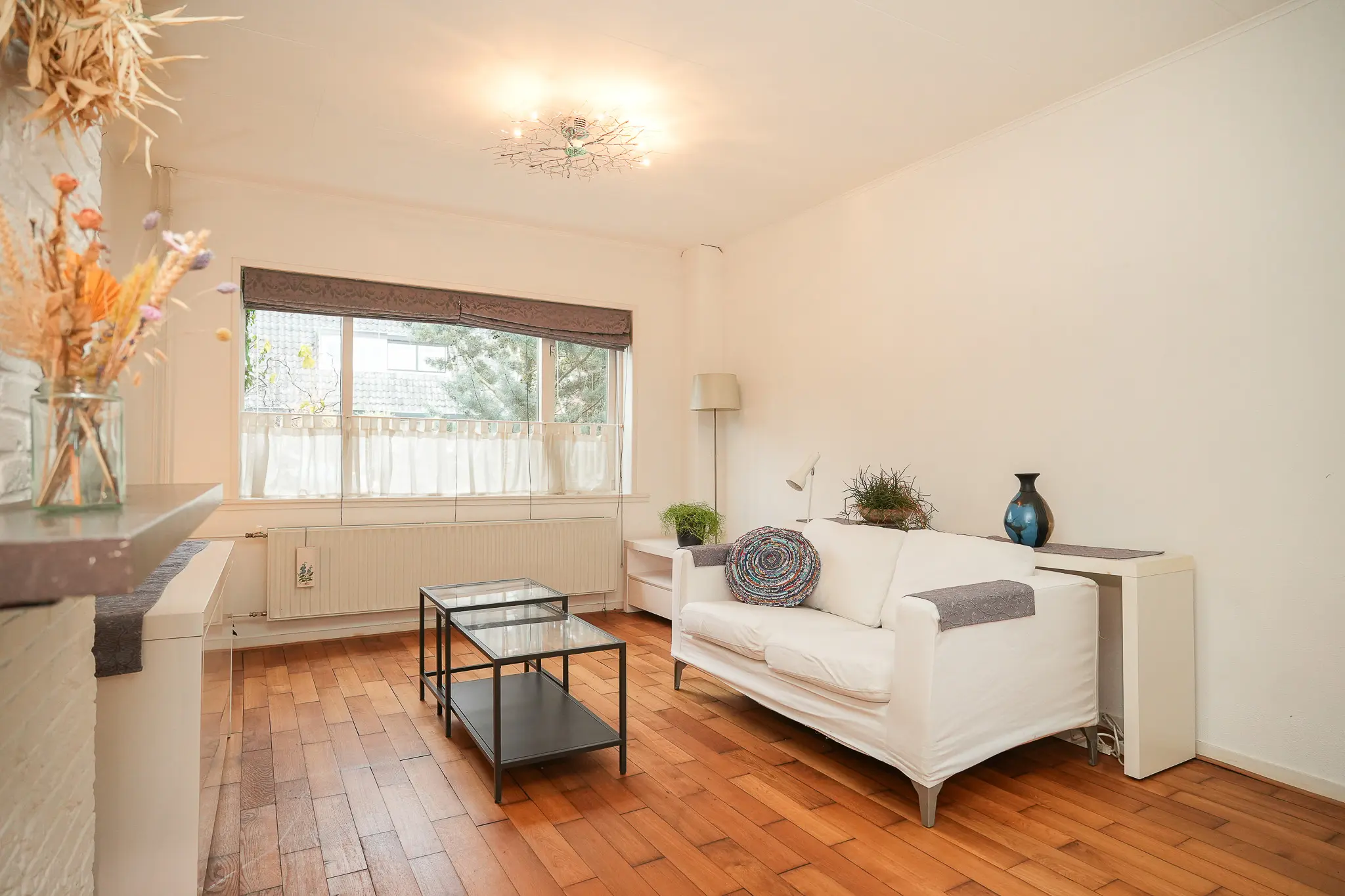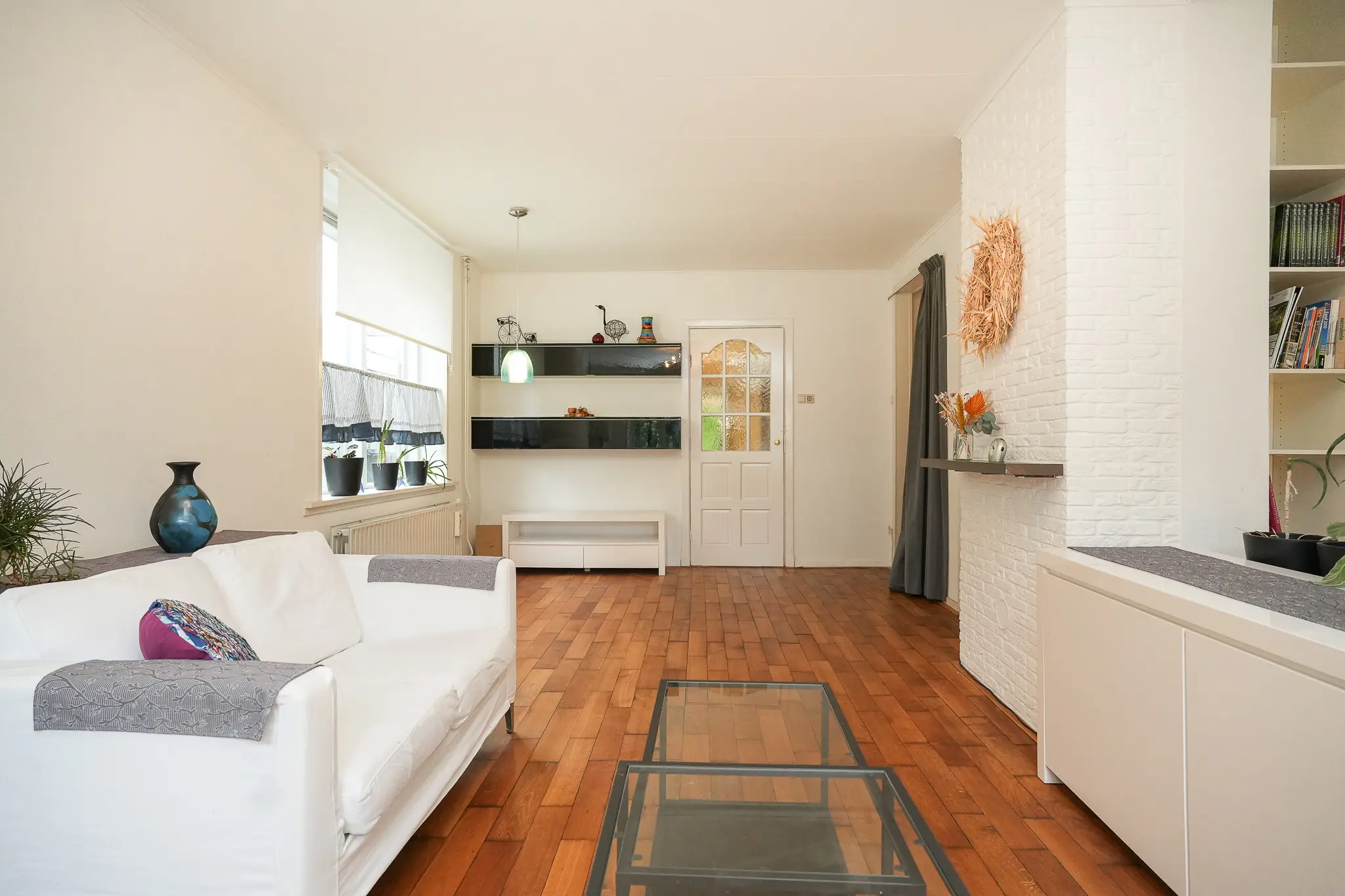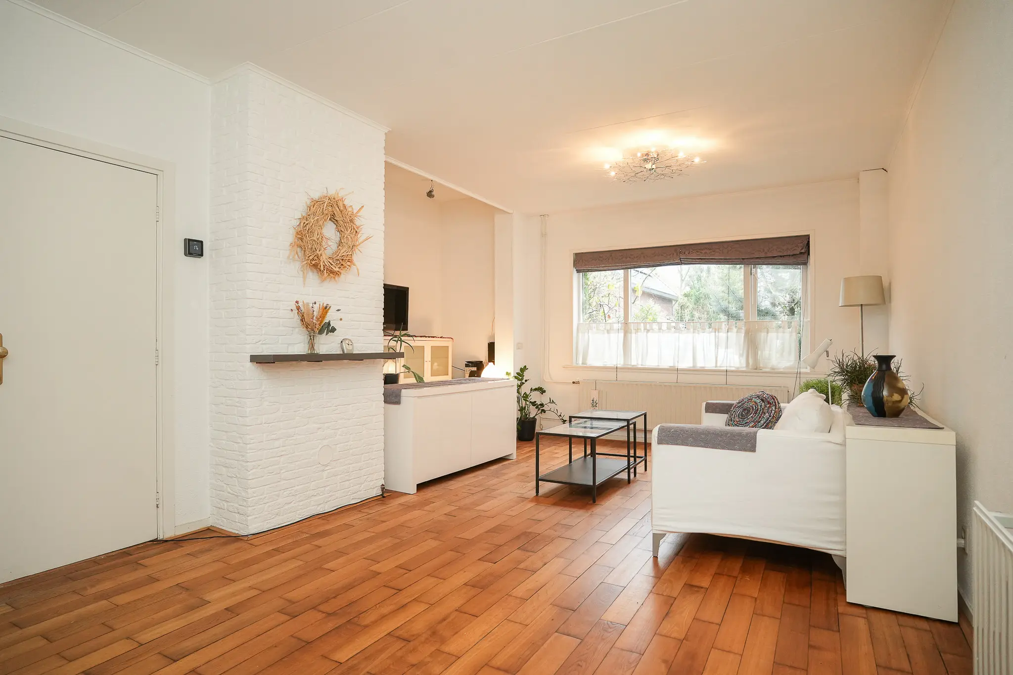 Aan de voorzijde van de woning ligt de sfeervolle woonkamer, afgewerkt met massief eiken vloerdelen en voorzien van karakteristieke elementen zoals de oude bedstee en toegang tot de kelder onder de voormalige bedstede. De ruimte voelt warm en licht door de raampartijen aan de voorzijde.