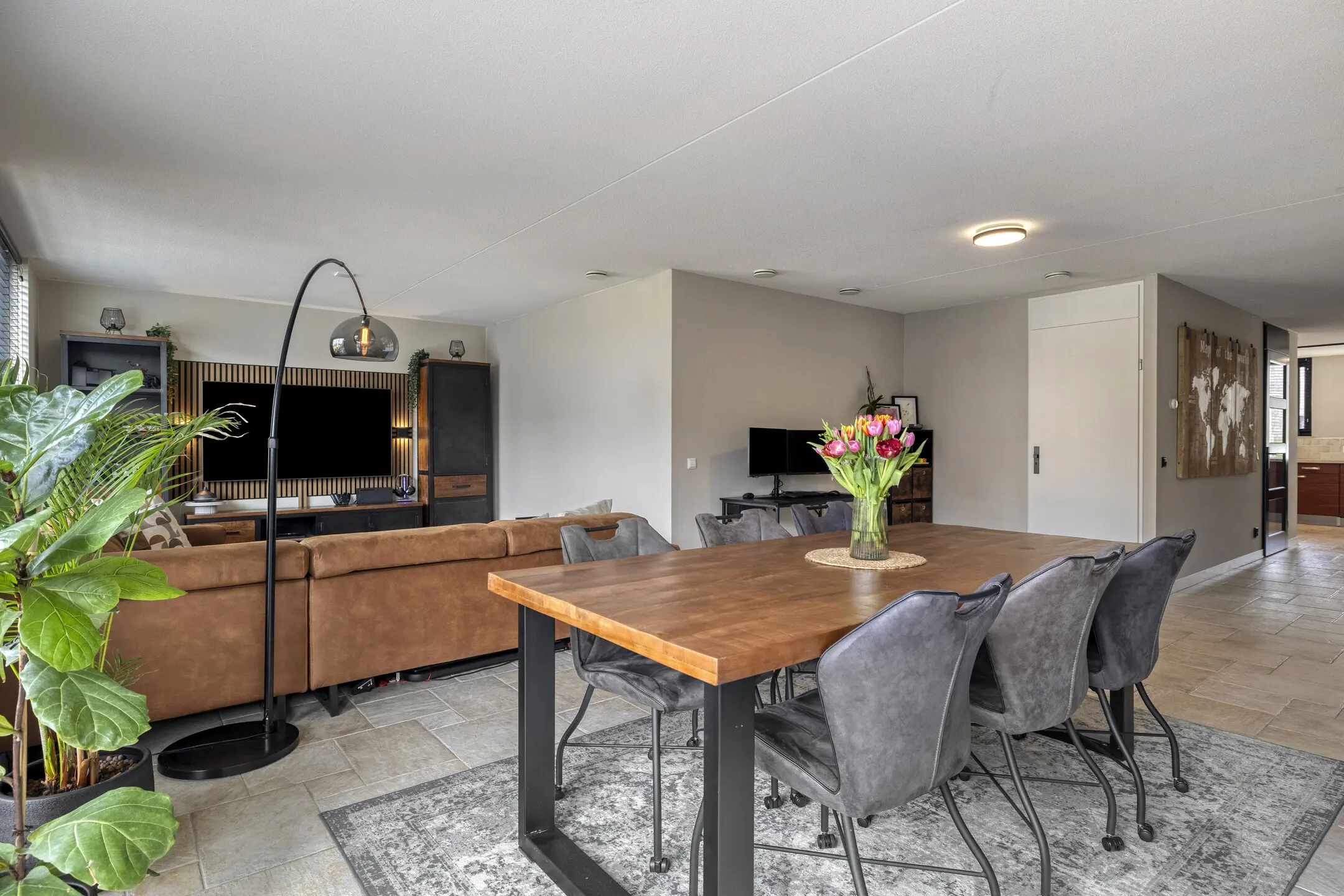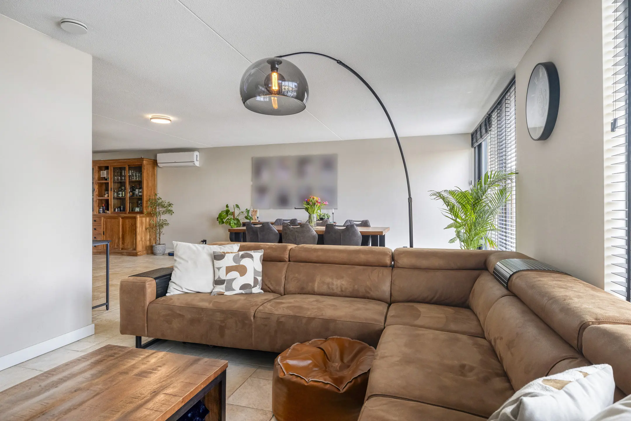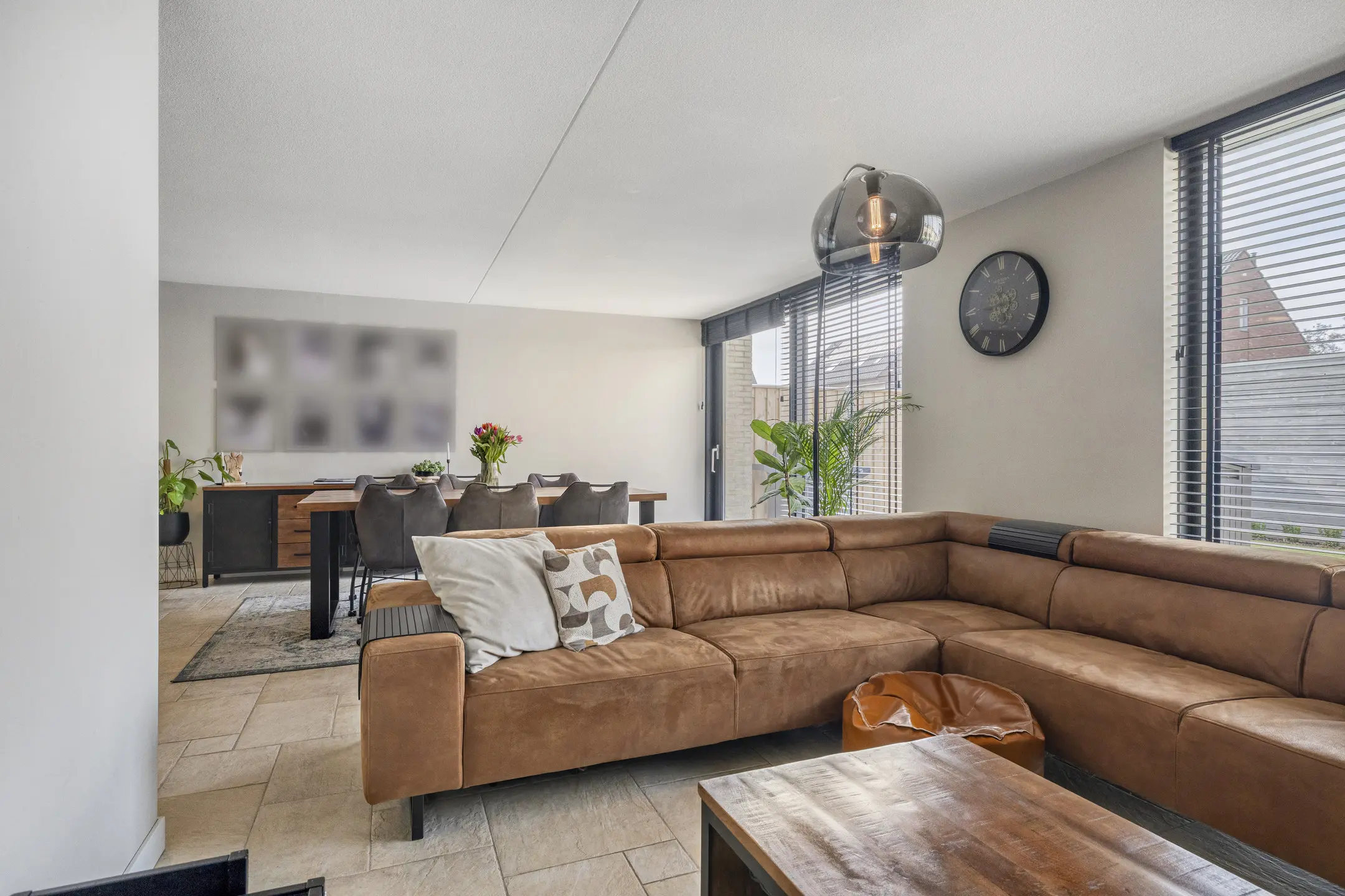 Woonkamer: Een heerlijk lichte en ruime woonkamer die voorzien is van vloerverwarming op warm water. De afwerking is modern met een plavuizen vloer.