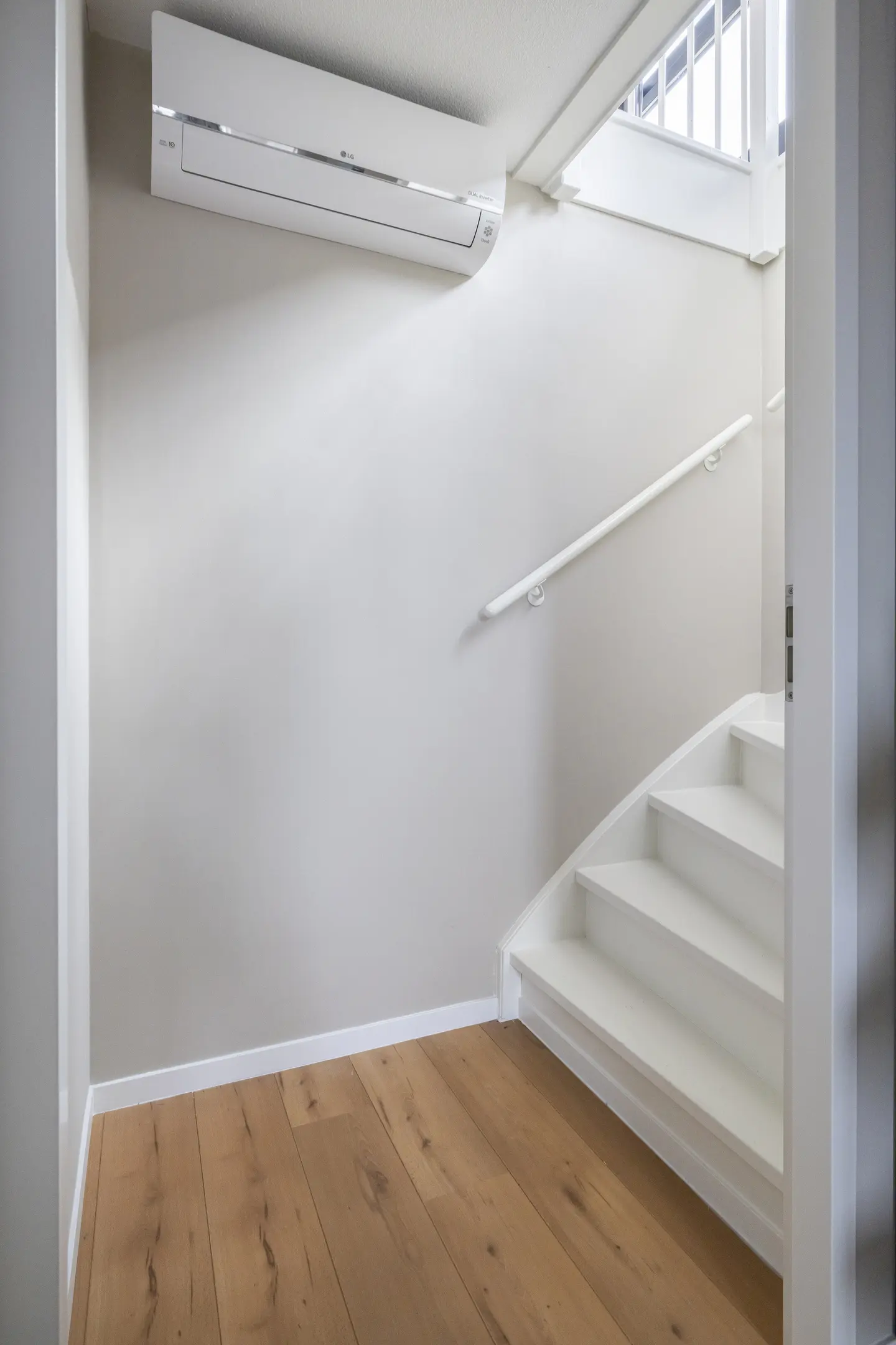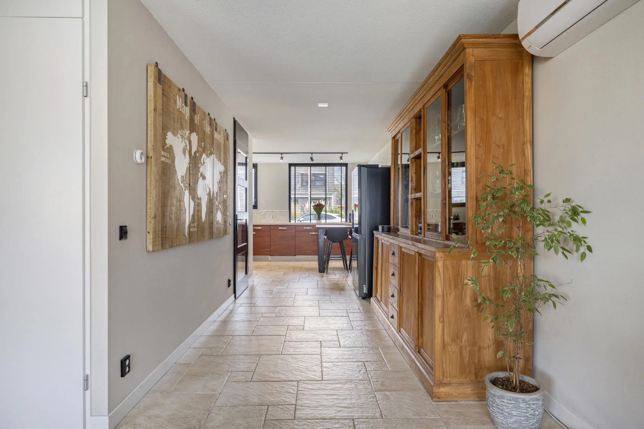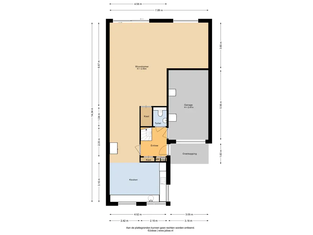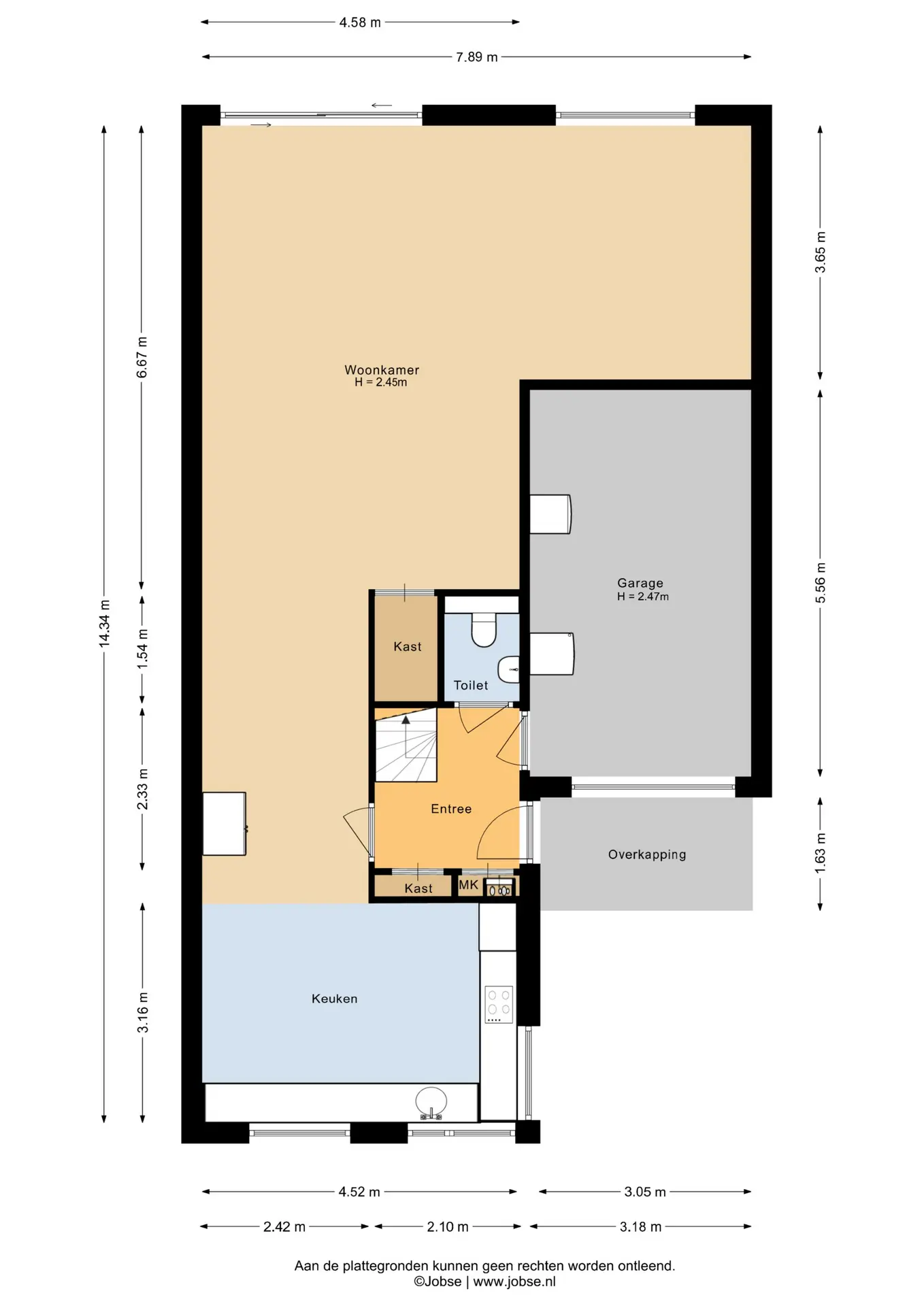 Bij binnenkomst treft u de hal met toegang tot het toilet, de trap naar de eerste verdieping,