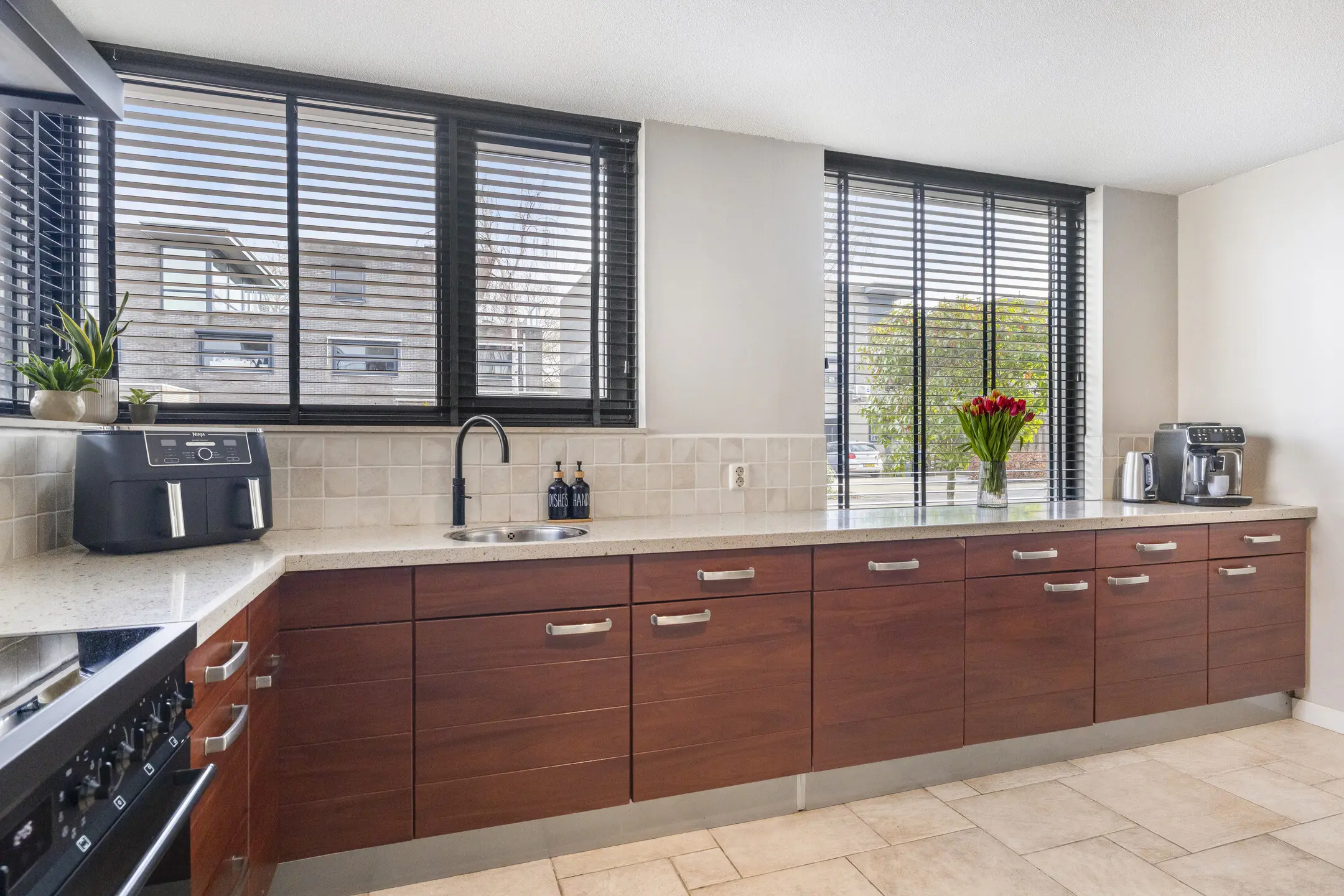 Keuken: De keuken heeft een complete opstelling voorzien van diverse inbouwapparatuur, waaronder, een inductiekookplaat, Een oven, vaatwasser en een Quooker voor direct kokend water.