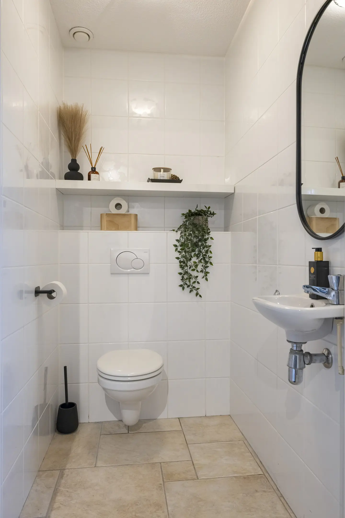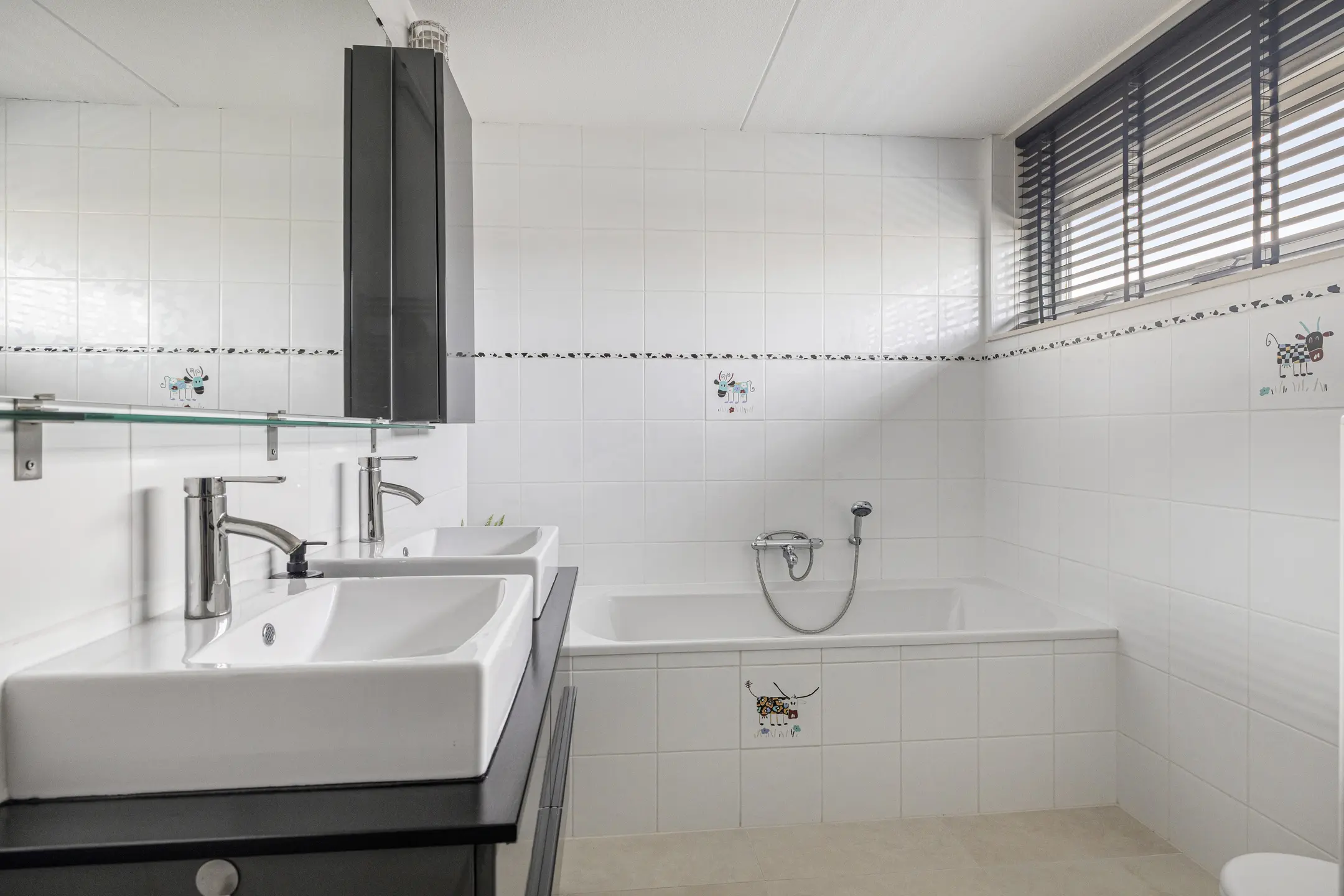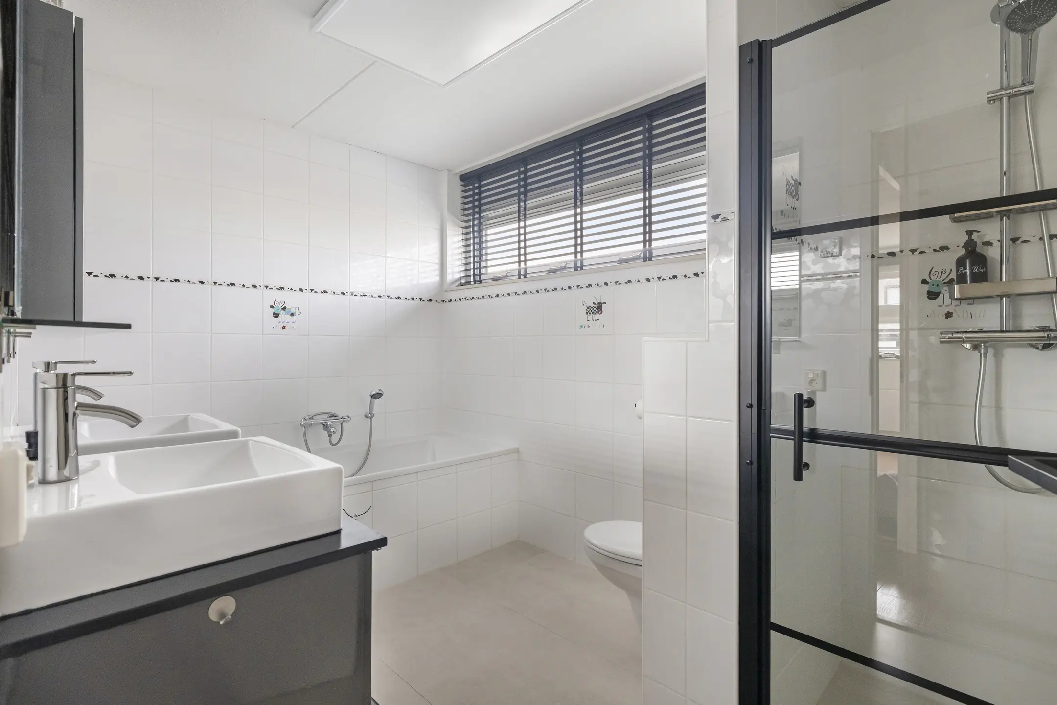 Badkamer: De nette badkamer is compleet uitgerust met een ligbad, een aparte douchecabine, een wastafelmeubel met dubbele wastafel en een tweede toilet.