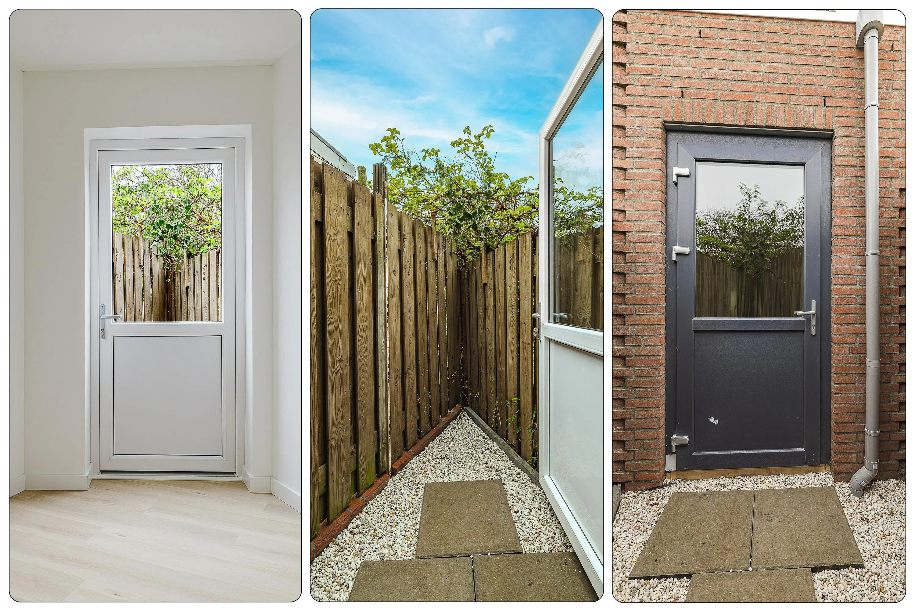 Aan de achterzijde bevindt zich een zeer compacte buitenruimte — geen traditionele tuin, maar wél een plek om even buiten te staan, frisse lucht te pakken of bijvoorbeeld je dag rustig te beginnen met een kop koffie.