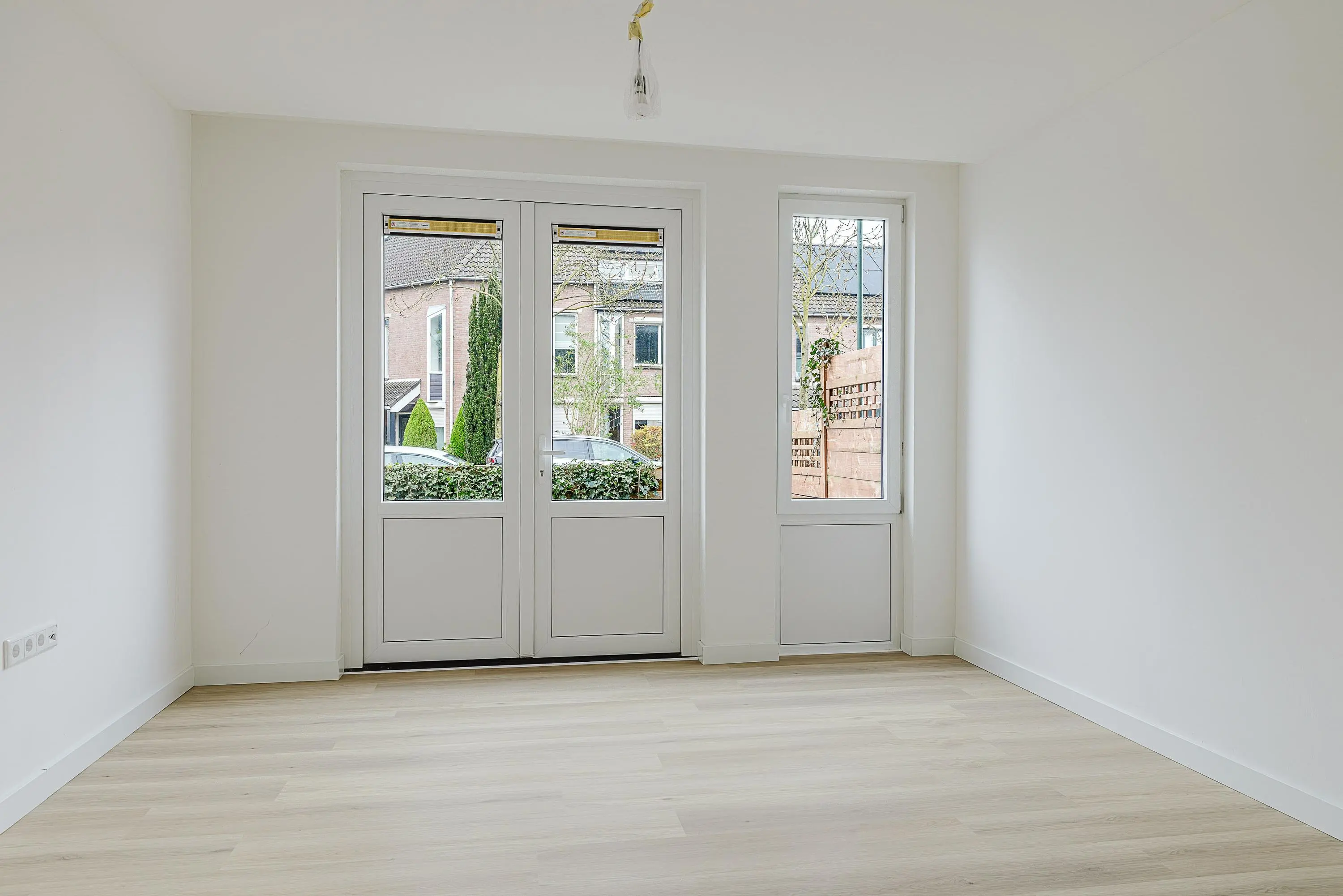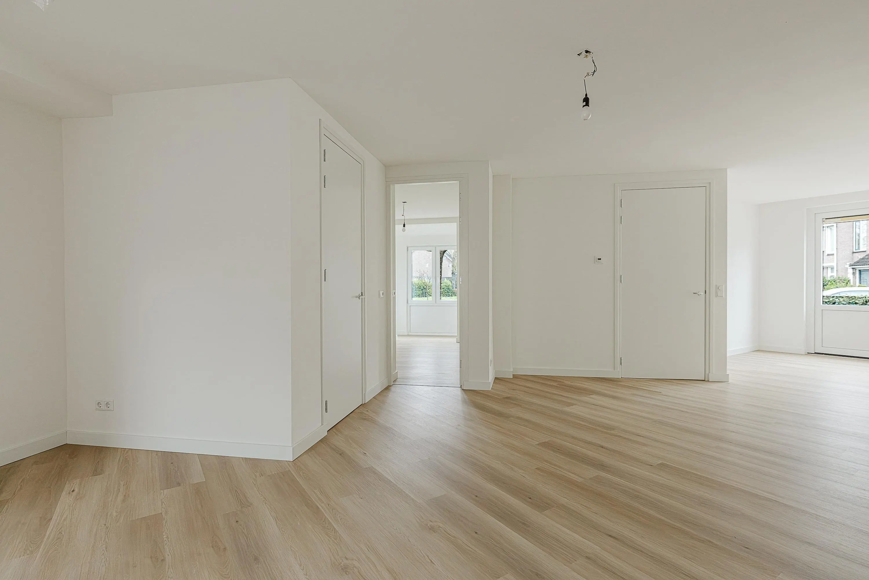 De woonkamer is prettig licht dankzij de grote raampartijen en vormt een fijne leefruimte. De neutrale basis zorgt ervoor dat je hier moeiteloos jouw eigen stijl kunt toevoegen.