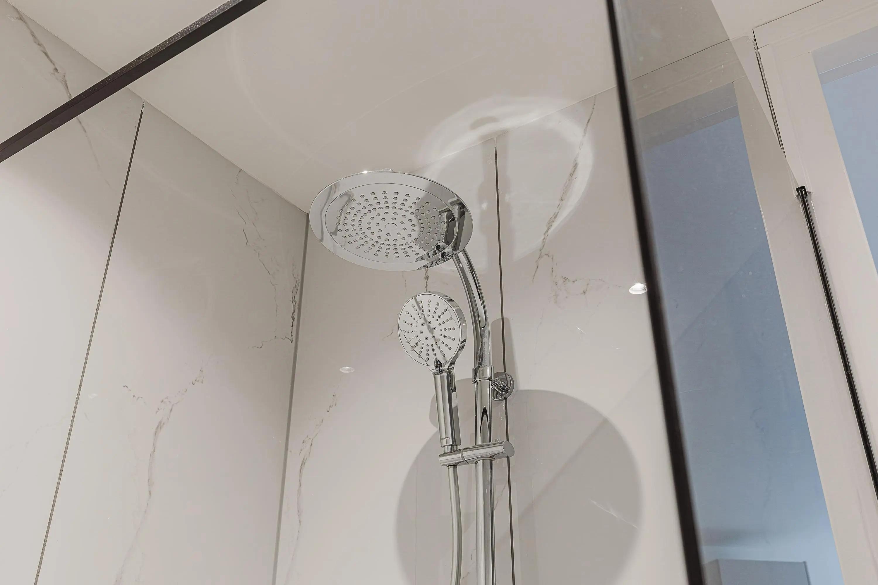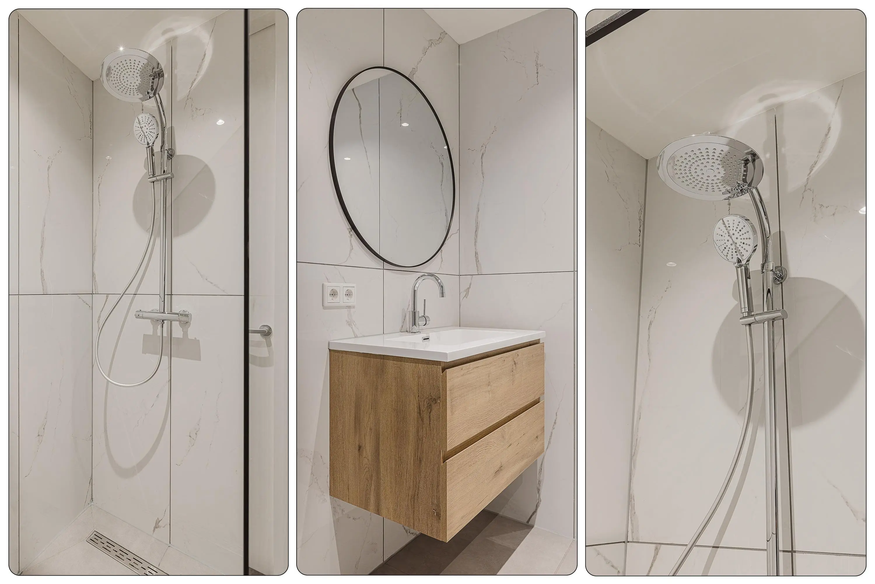 De ruimte is praktisch ingedeeld en voorzien van een eigentijdse afwerking met lichte tinten, wat zorgt voor een ruimtelijk en verzorgd gevoel. Hier start je de dag comfortabel en ontspannen